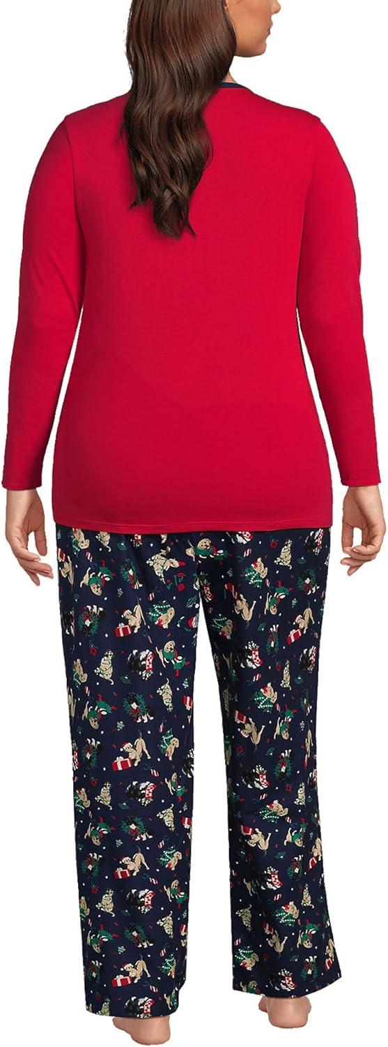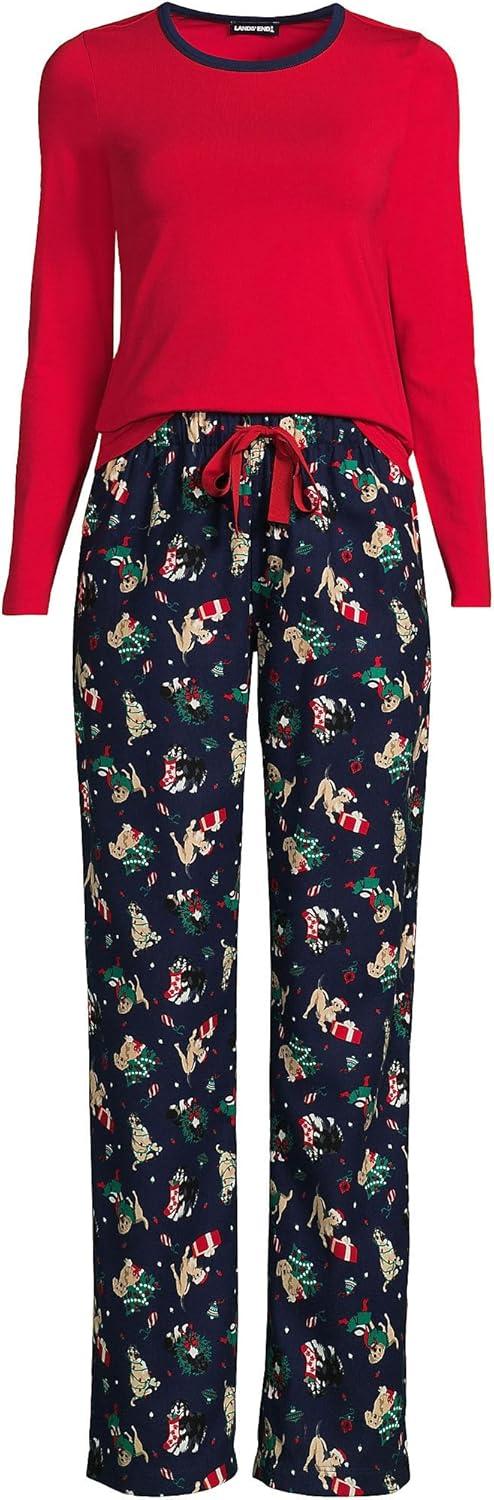 • Lands’ End Women’s Pajama Set Knit Long Sleeve T-Shirt and Flannel Pants(Deep Sea Navy Holiday Pups)