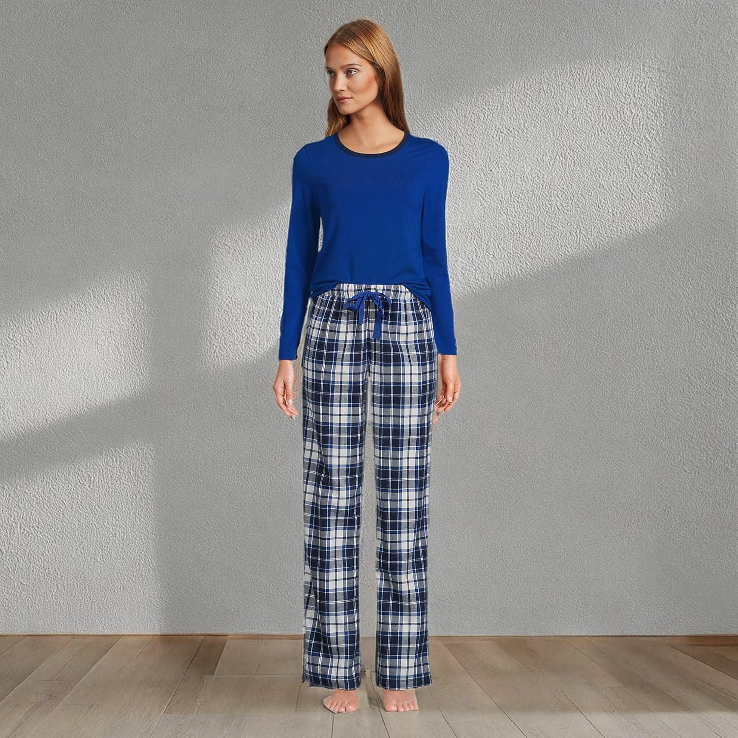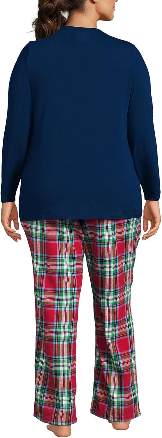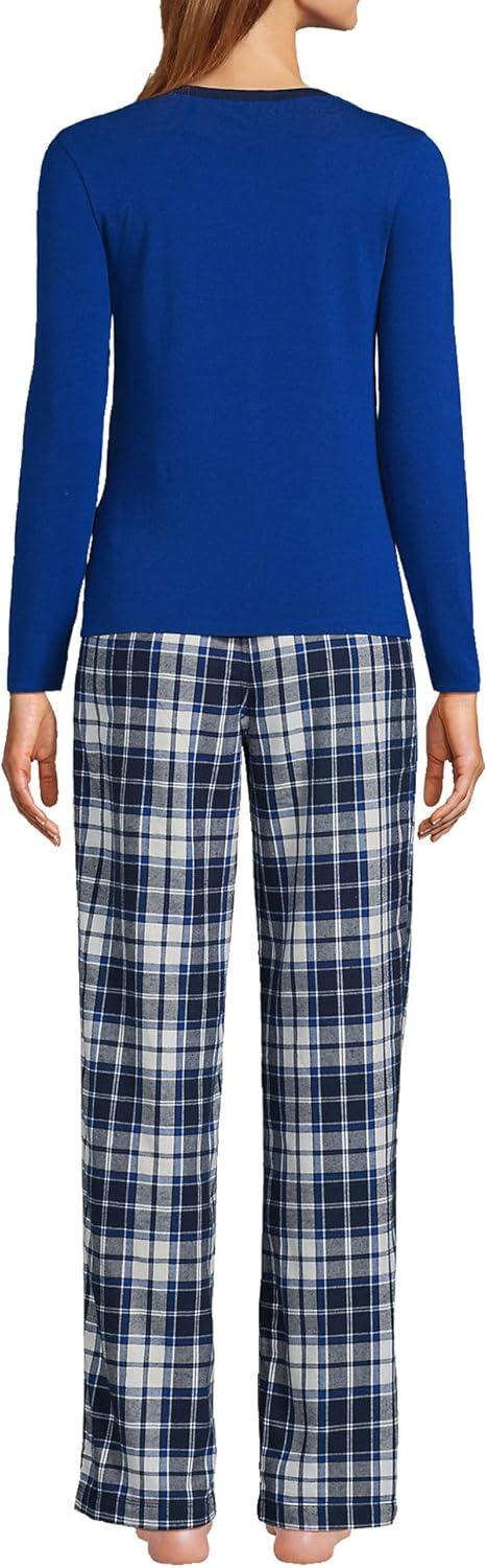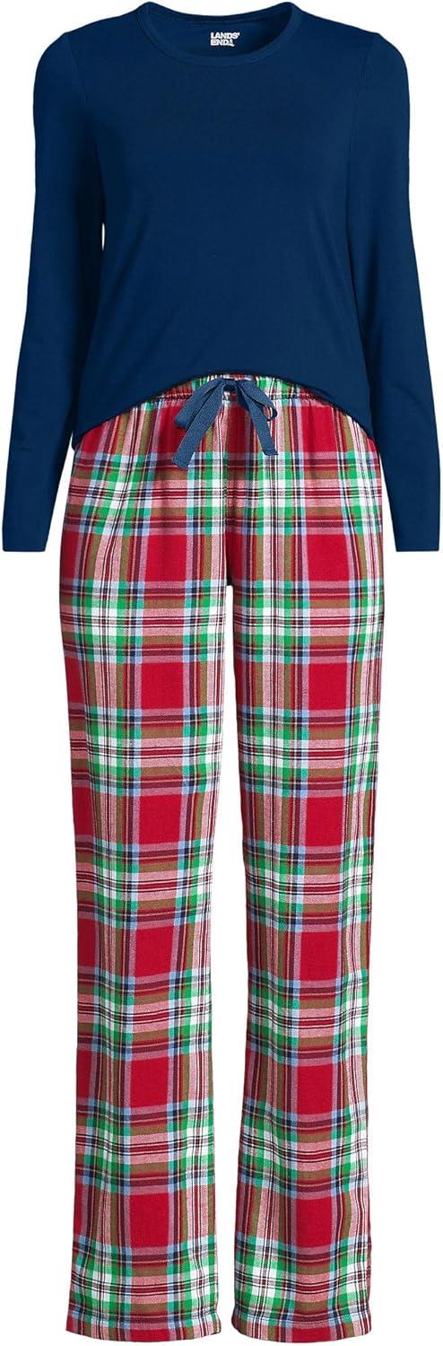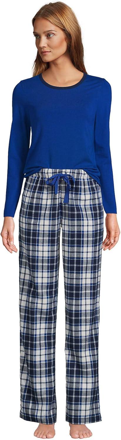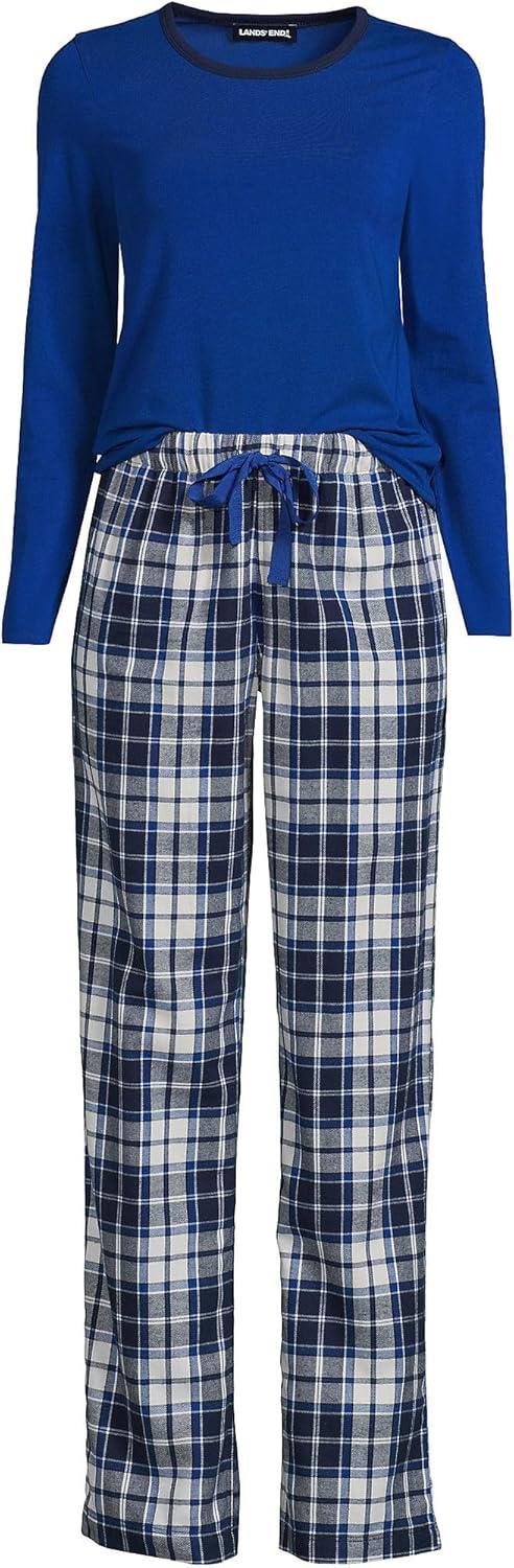 Lands’ End Women’s Pajama Set Knit Long Sleeve T-Shirt and Flannel Pants(Deep Sea Navy/Ivory Plaid)