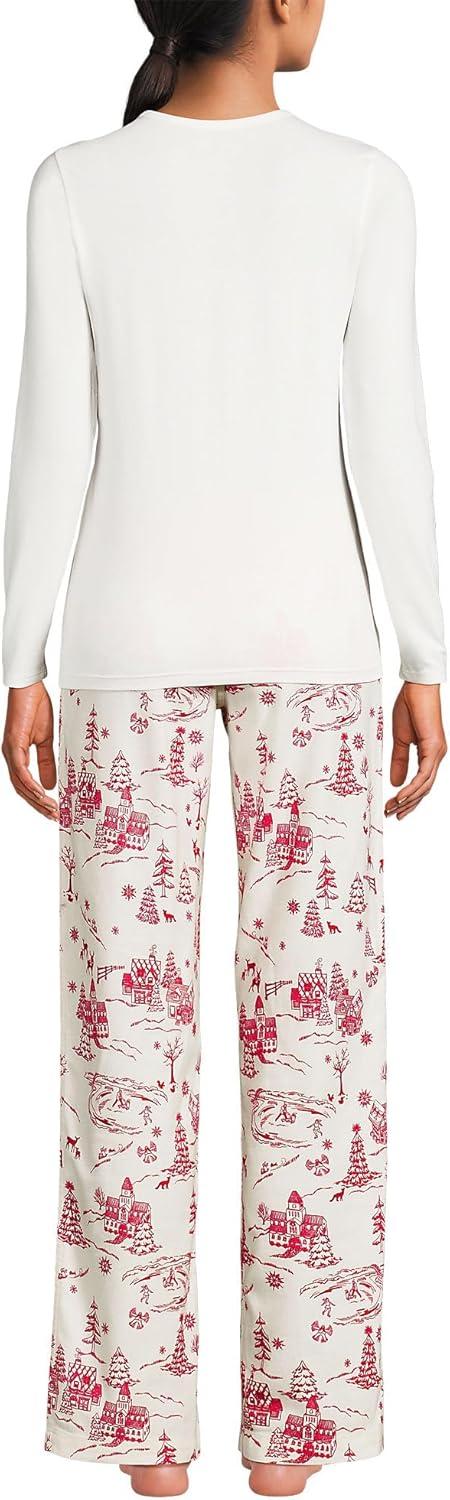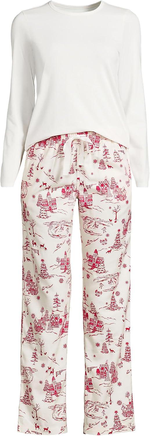 • Lands’ End Women’s Pajama Set Knit Long Sleeve T-Shirt and Flannel Pants(Ivory/Red Winter Village)