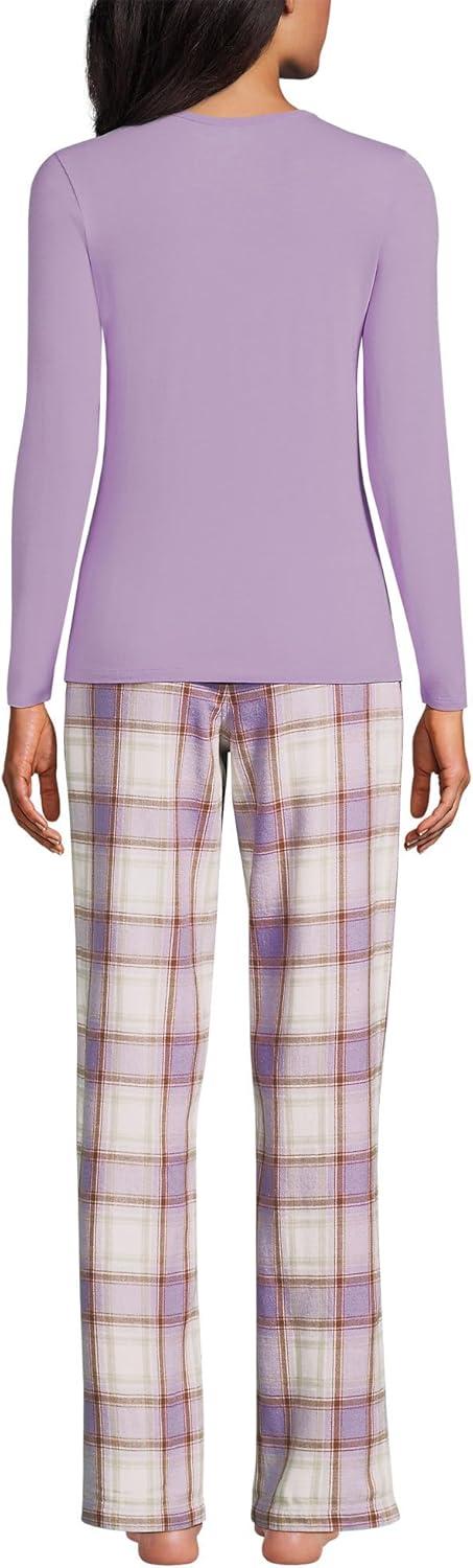 • Lands’ End Women’s Pajama Set Knit Long Sleeve T-Shirt and Flannel Pants(Ivory/Violet Verbena Plaid)
