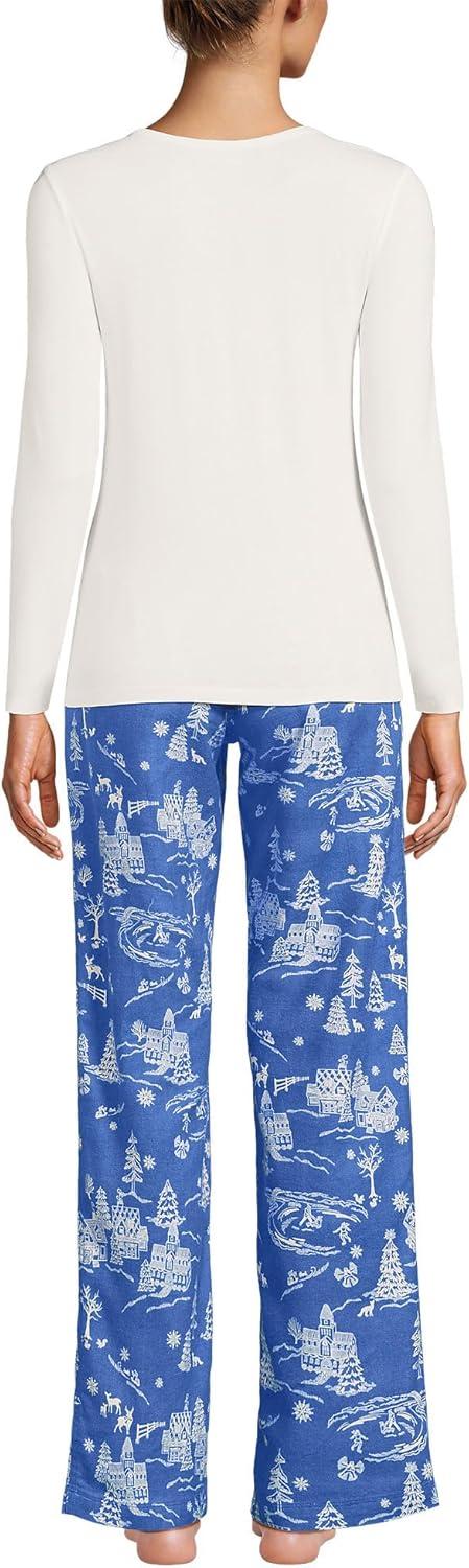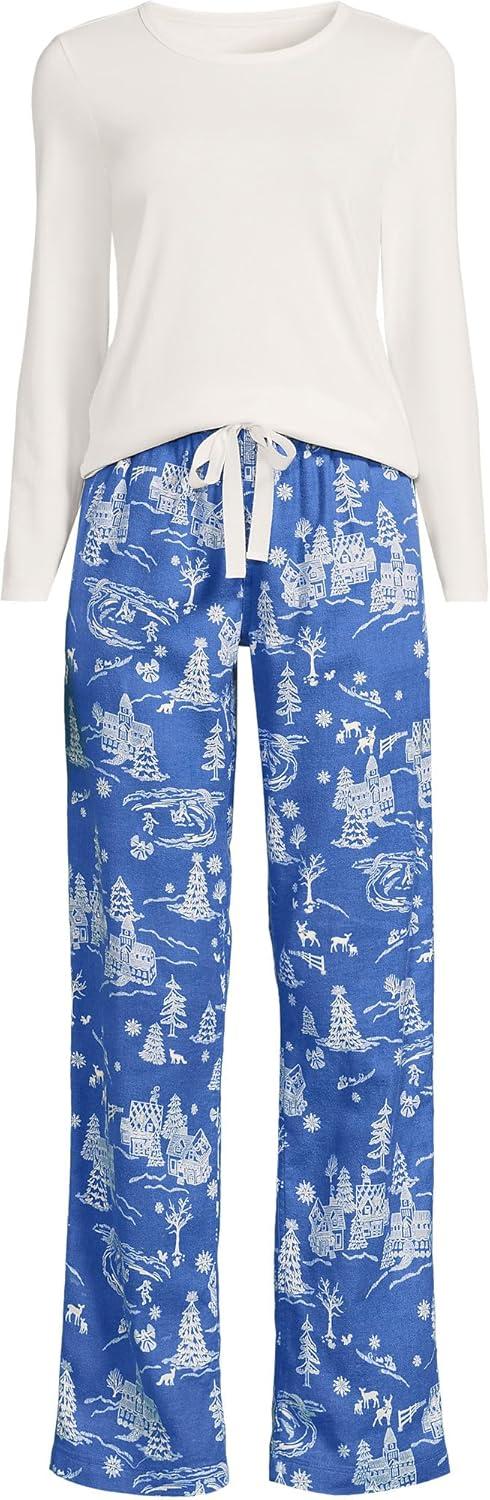 • Lands’ End Women’s Pajama Set Knit Long Sleeve T-Shirt and Flannel Pants(Muted Cobalt Winter Village)