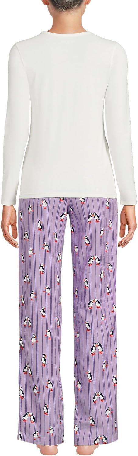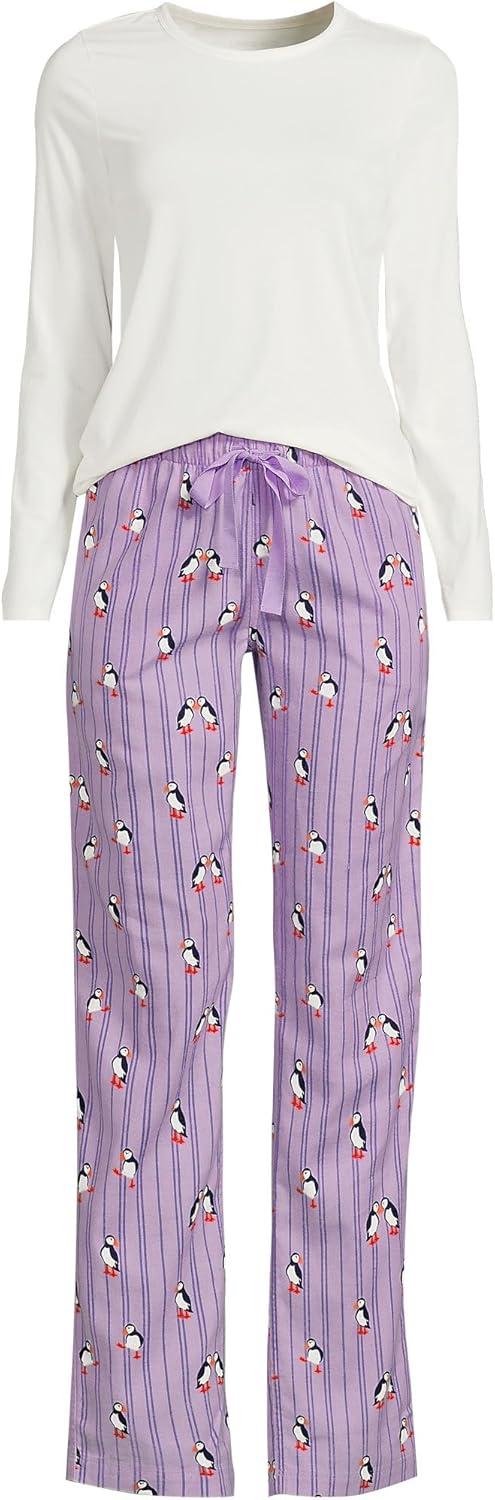 • Lands’ End Women’s Pajama Set Knit Long Sleeve T-Shirt and Flannel Pants(Whisper Lilac Playful Puffins)