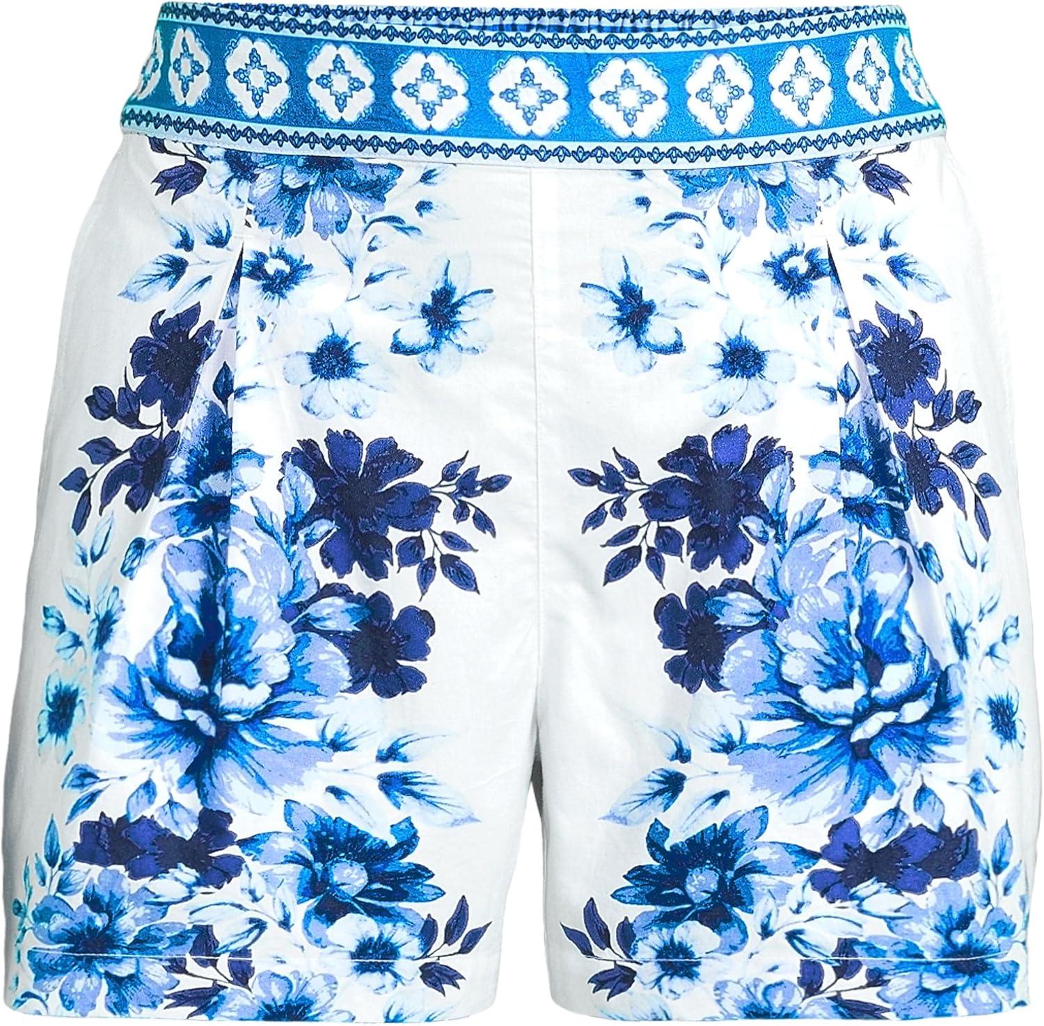 Lands’ End Women’s Poplin Pull On Pleated 5″ Shorts – Set Bottom(Blue/White Floral Mosaic)