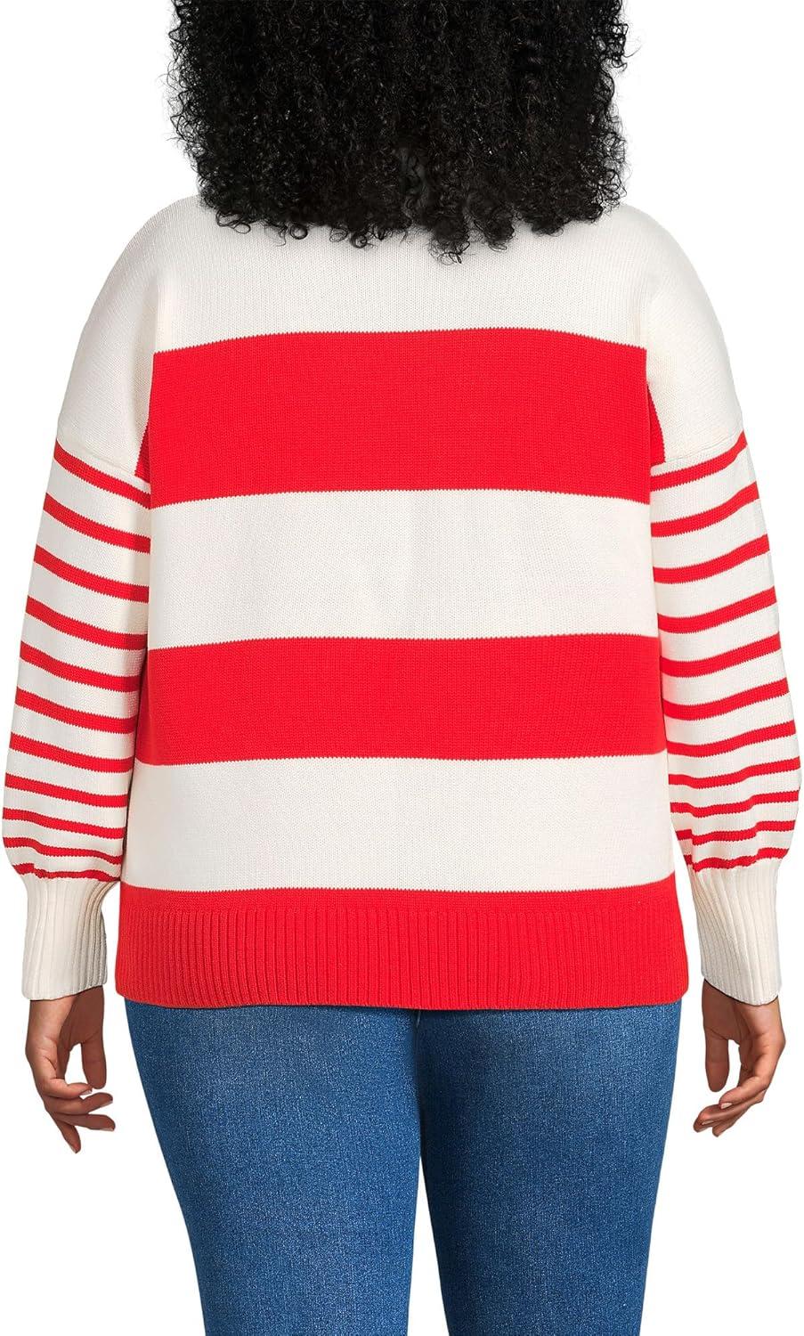 Lands’ End Women’s Drifter Jersey Crewneck Sweater(Coral Red/Ivory Stripes)