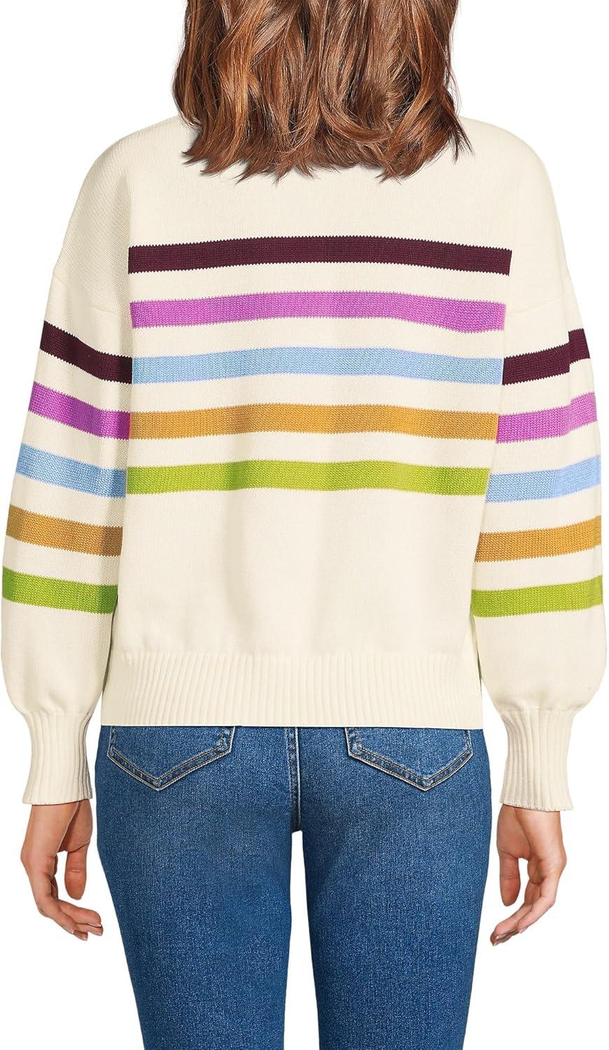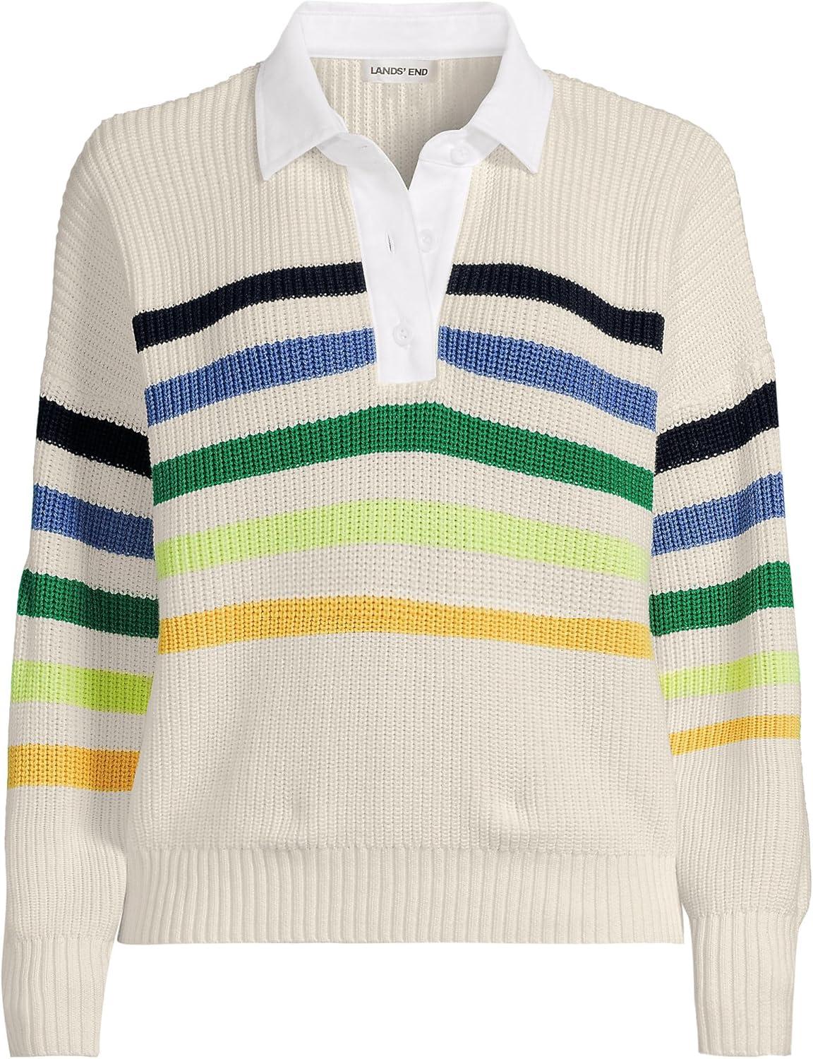 Lands’ End Women’s Drifter Rugby with Woven Collar Sweater(Ivory/Multi Gem Placed Stripe)