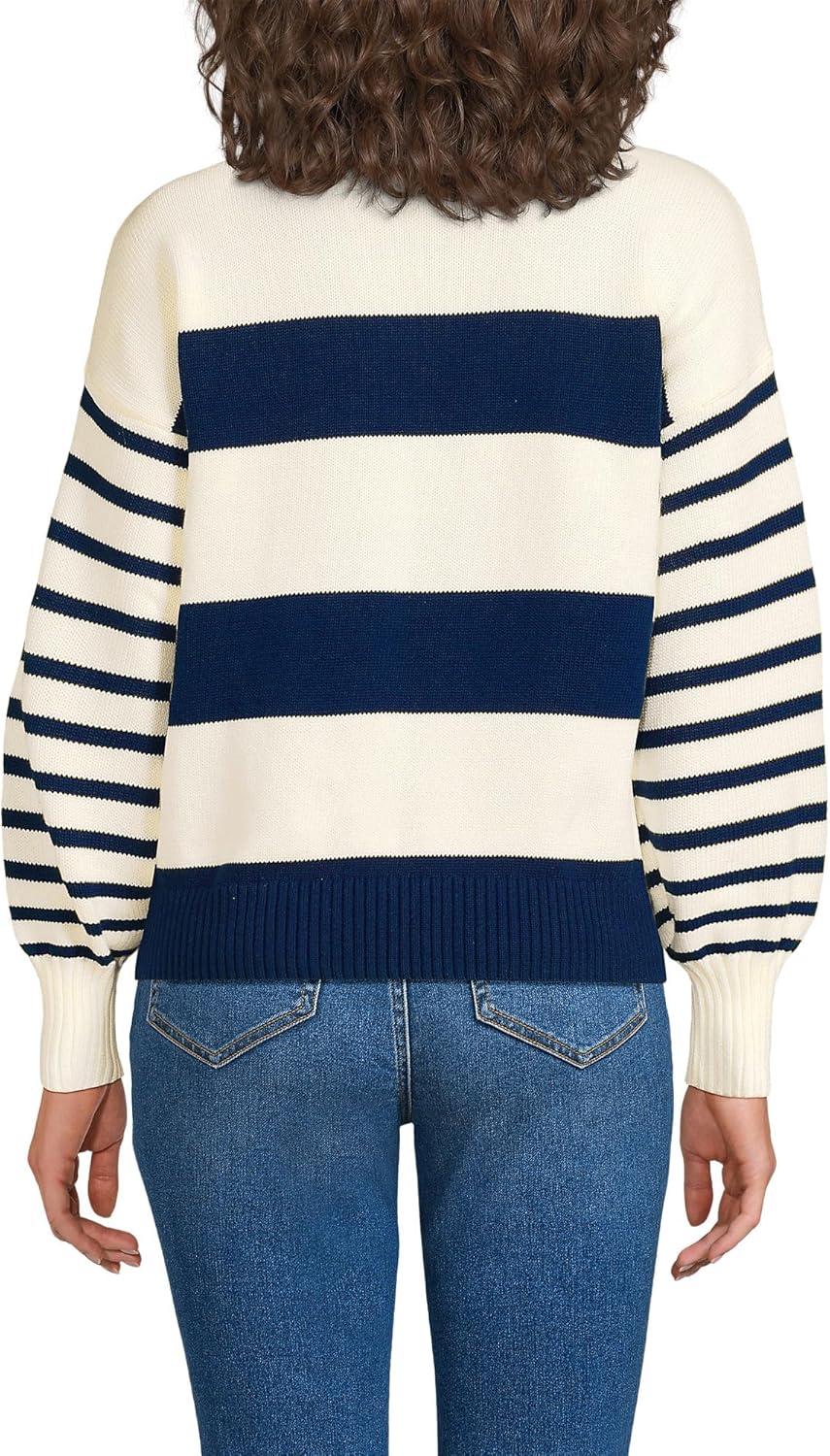 Lands’ End Women’s Drifter Cotton Quarter Zip Pullover Sweater(Ivory/Navy Stripe)