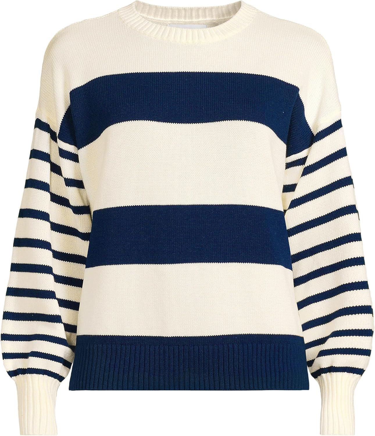 Lands’ End Women’s Drifter Jersey Crewneck Sweater(Navy/Fresh Ivory Wide Stripe)