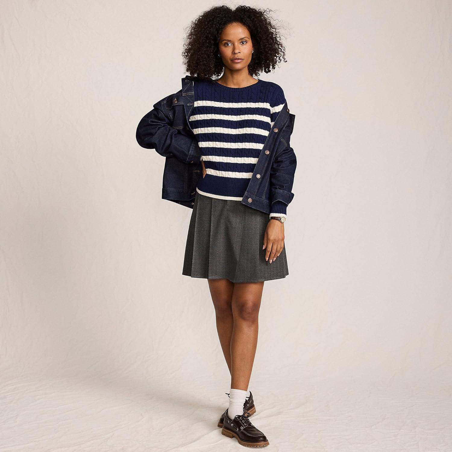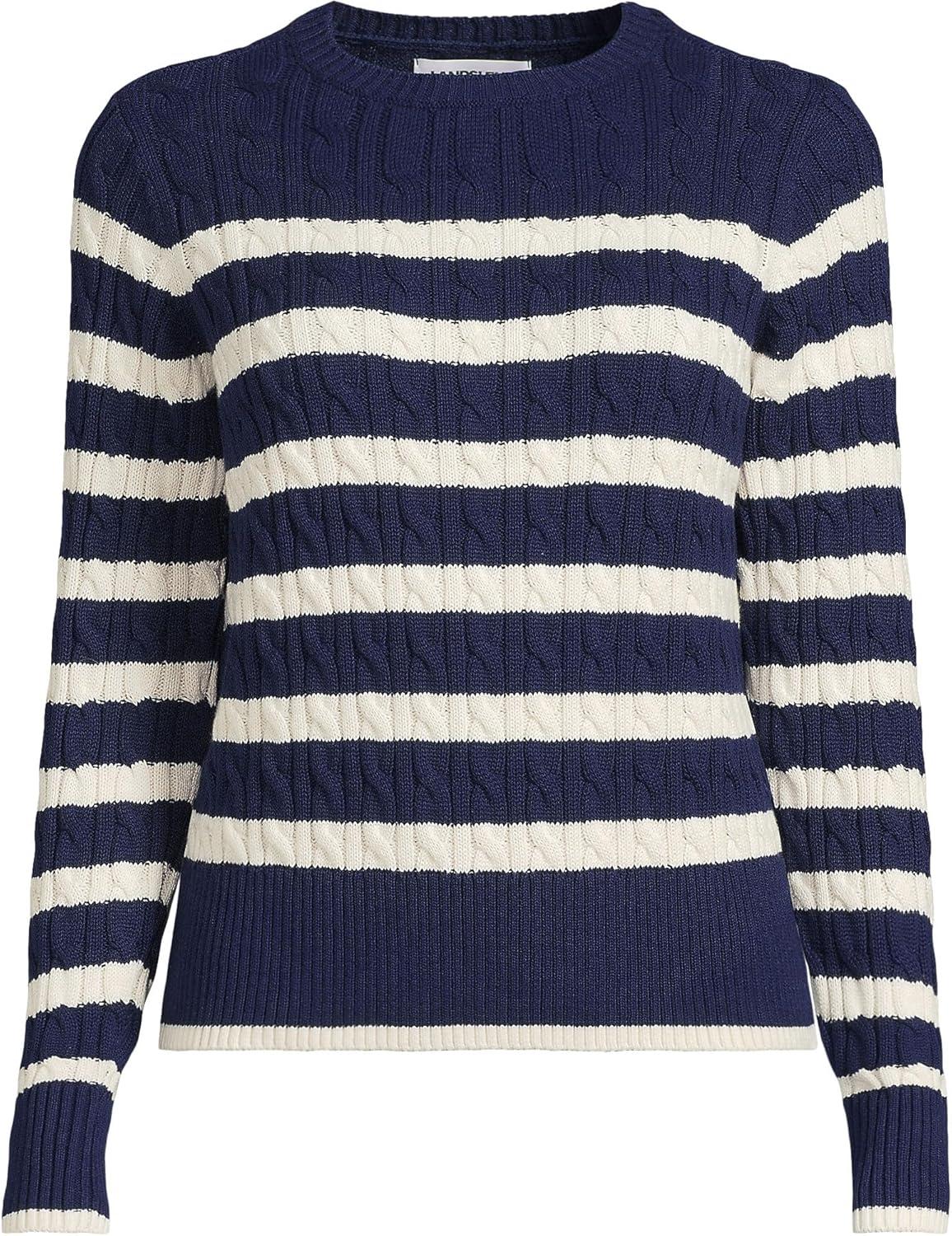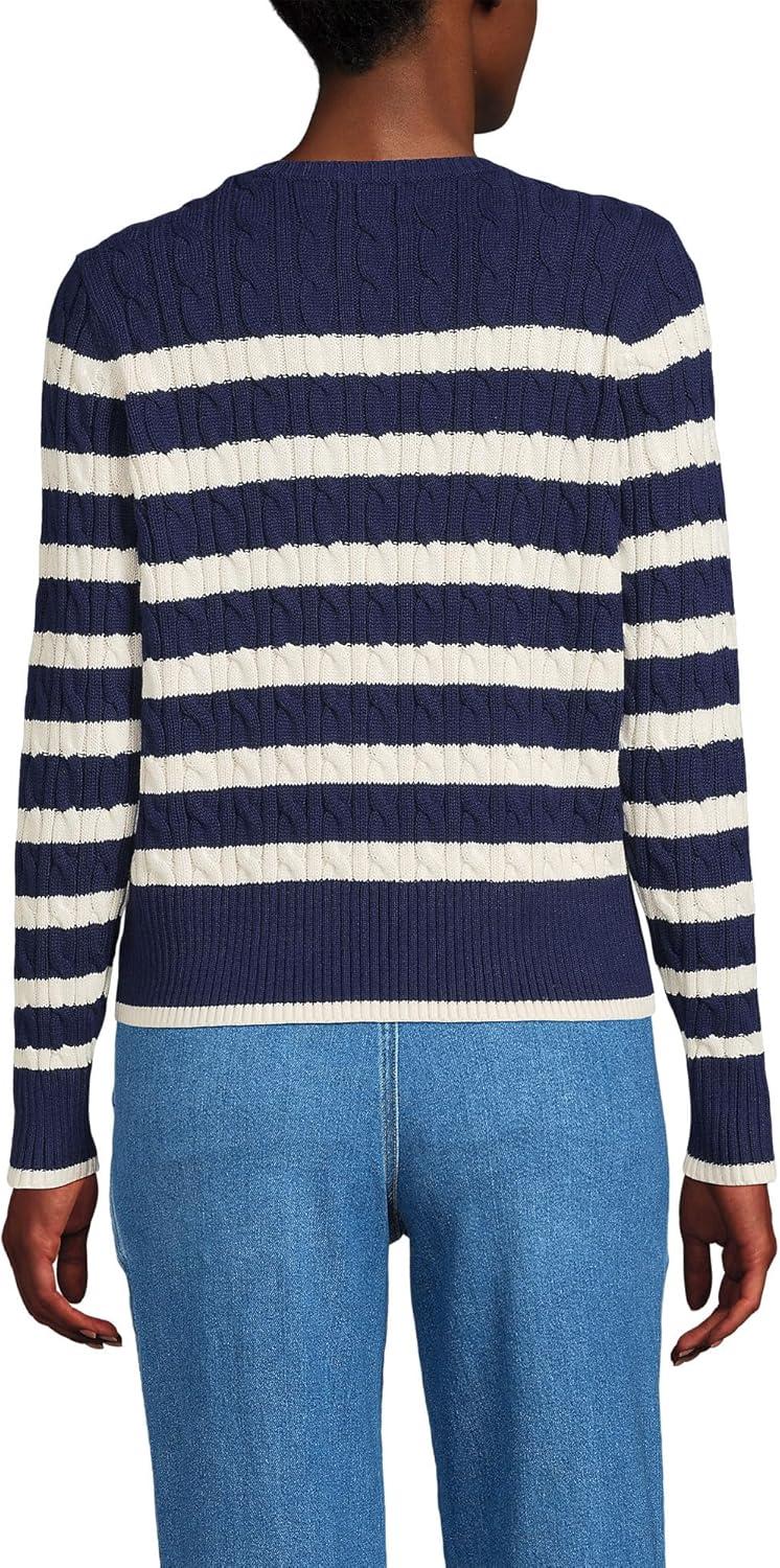 Lands’ End Women’s Drifter Modern Cable Crew Sweater(Deep Sea Navy/Ivory Stripe)