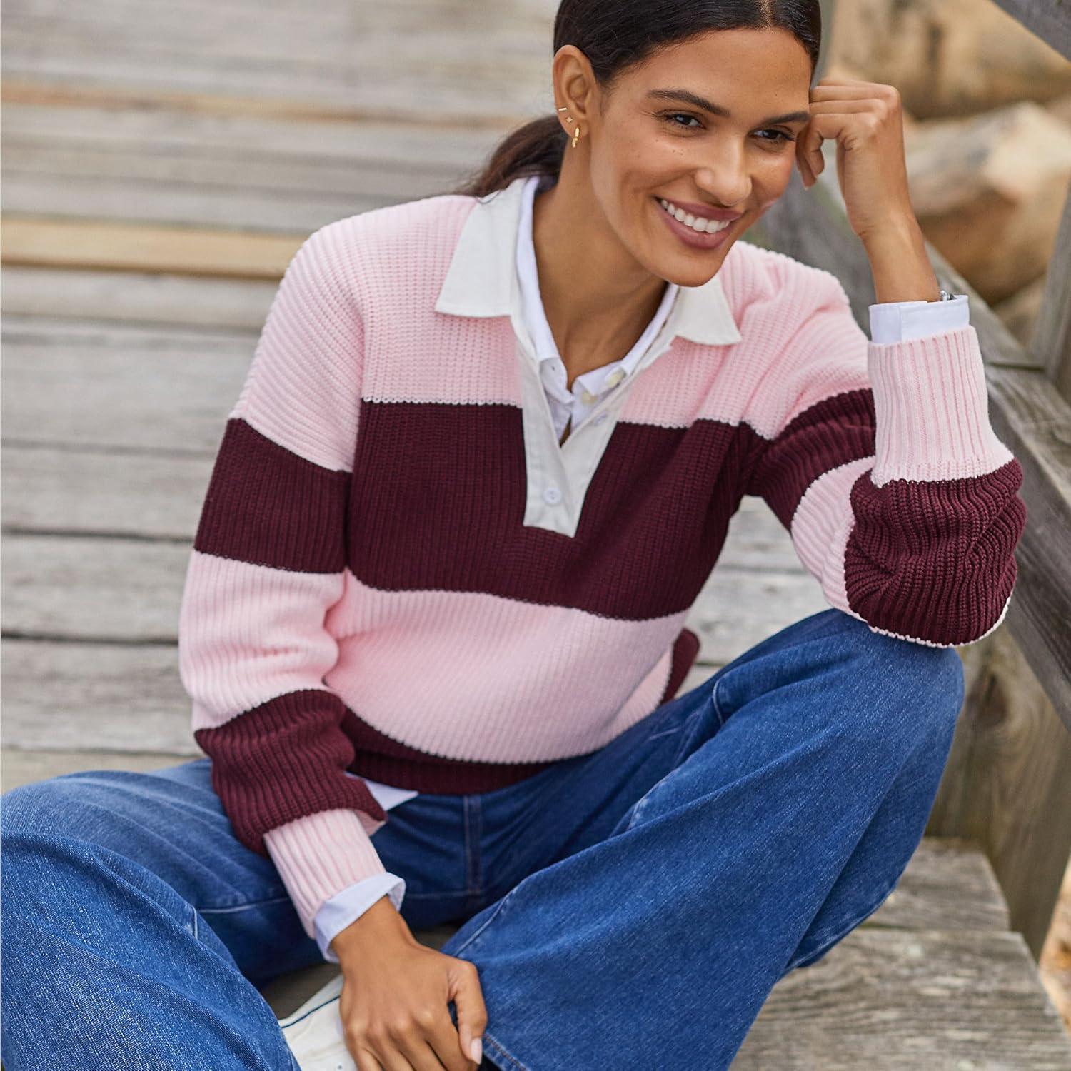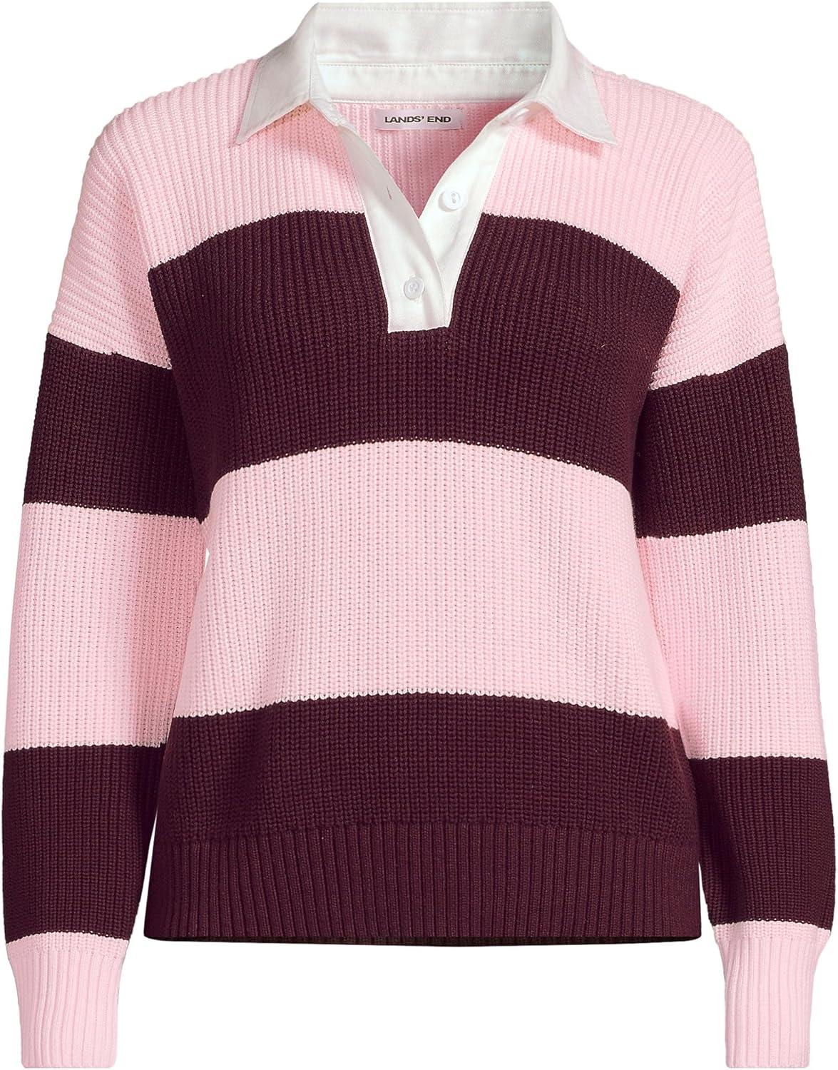 Lands’ End Women’s Drifter Rugby with Woven Collar Sweater(Lush Burgundy/Pink Rugby)