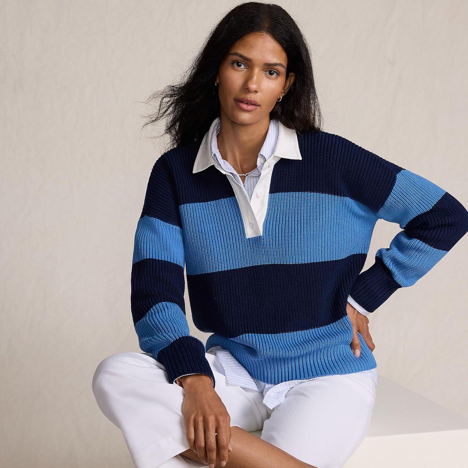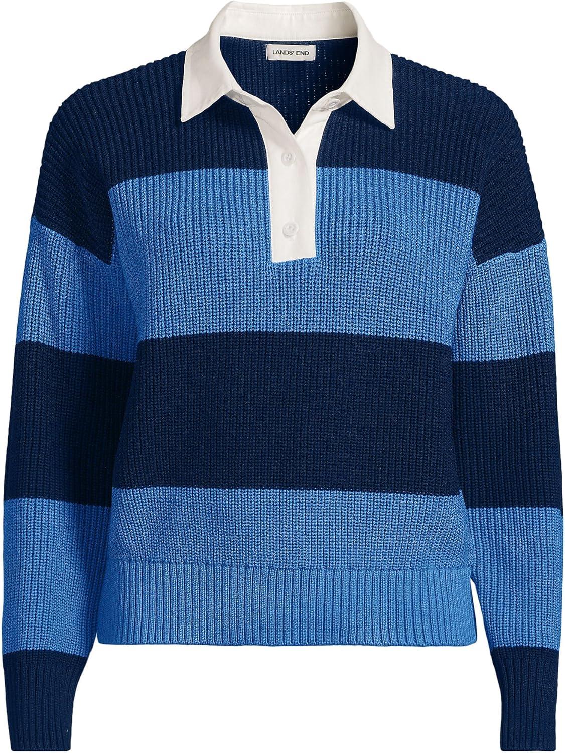 Lands’ End Women’s Drifter Rugby with Woven Collar Sweater(Muted Cobalt Blue/Navy Rugby)