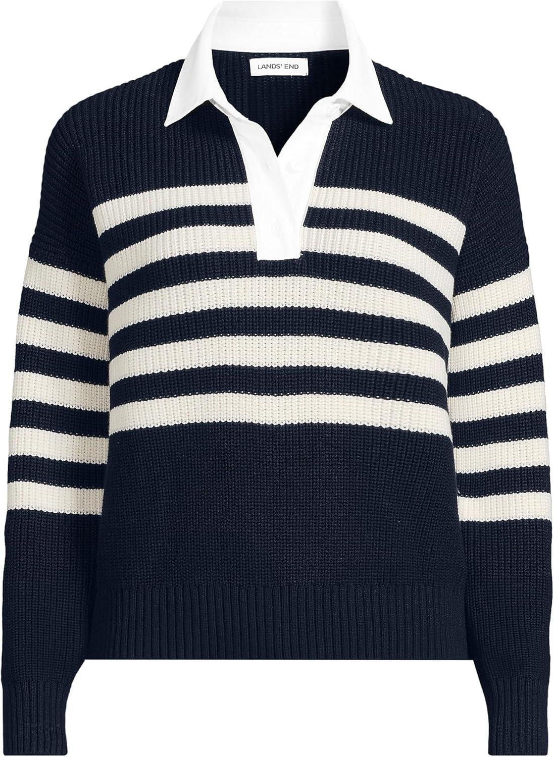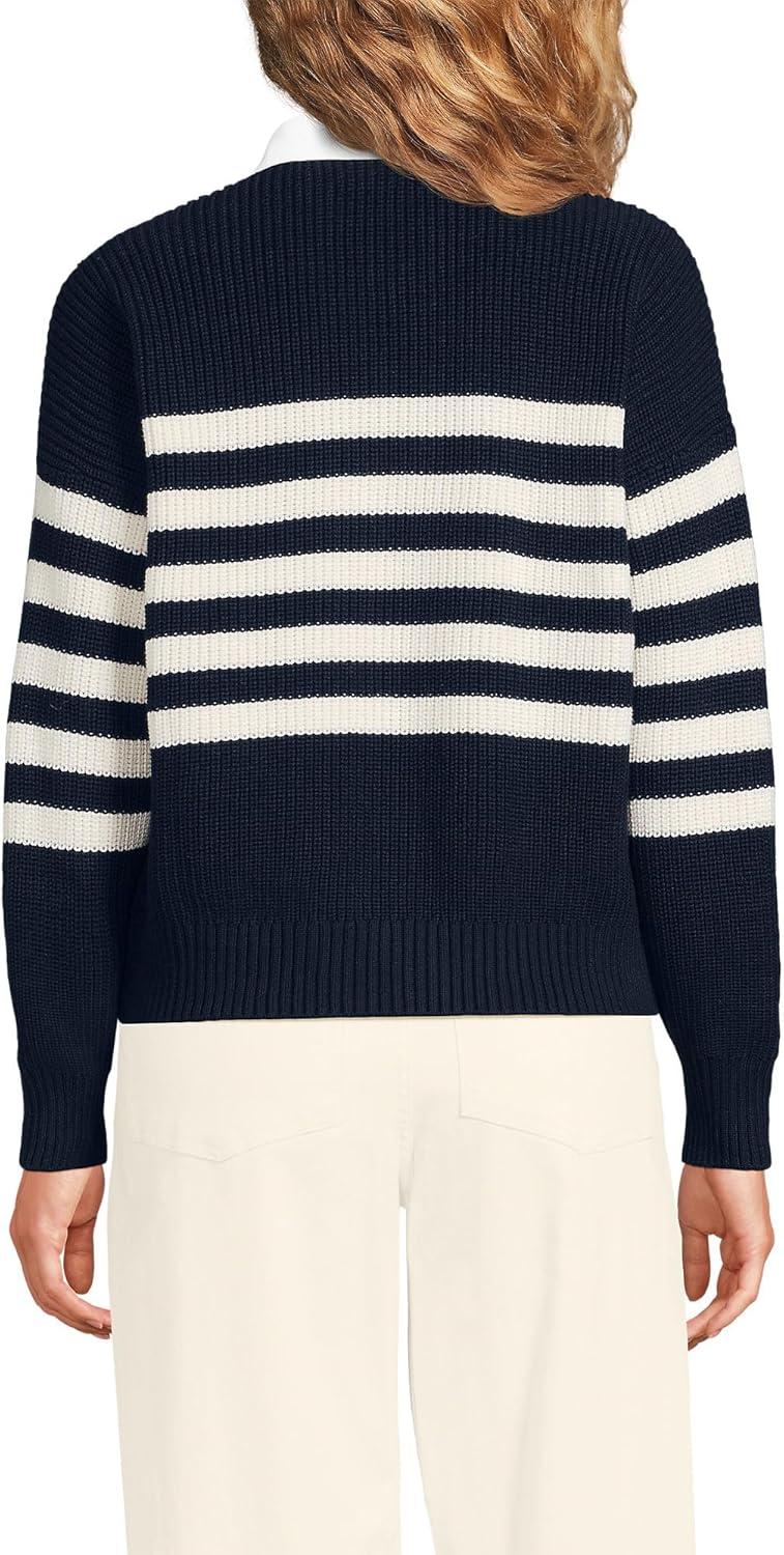 Lands’ End Women’s Drifter Rugby with Woven Collar Sweater(Navy/Ivory Placed Stripe)