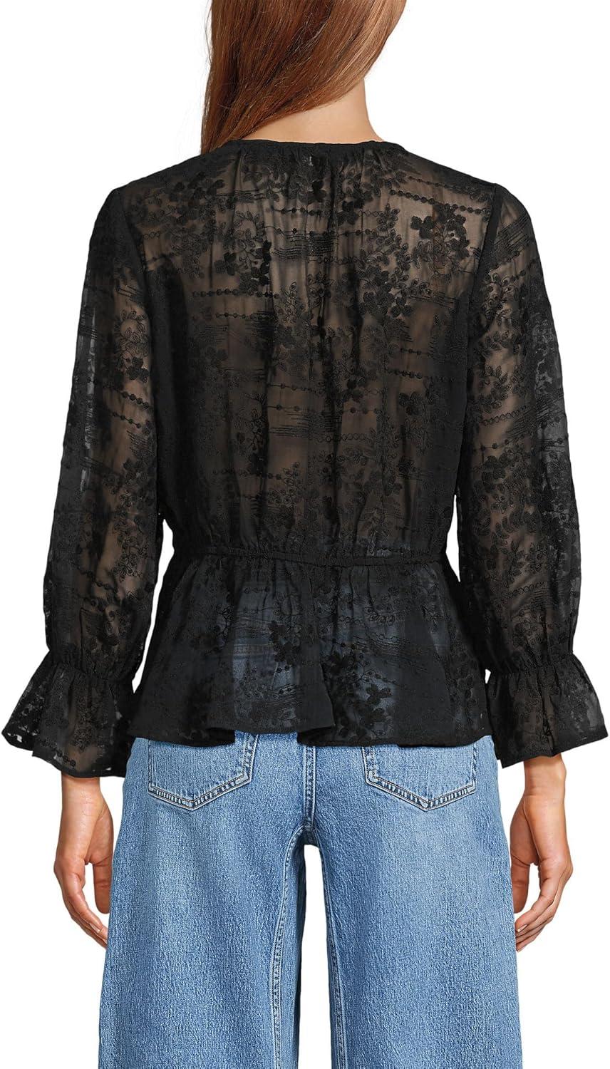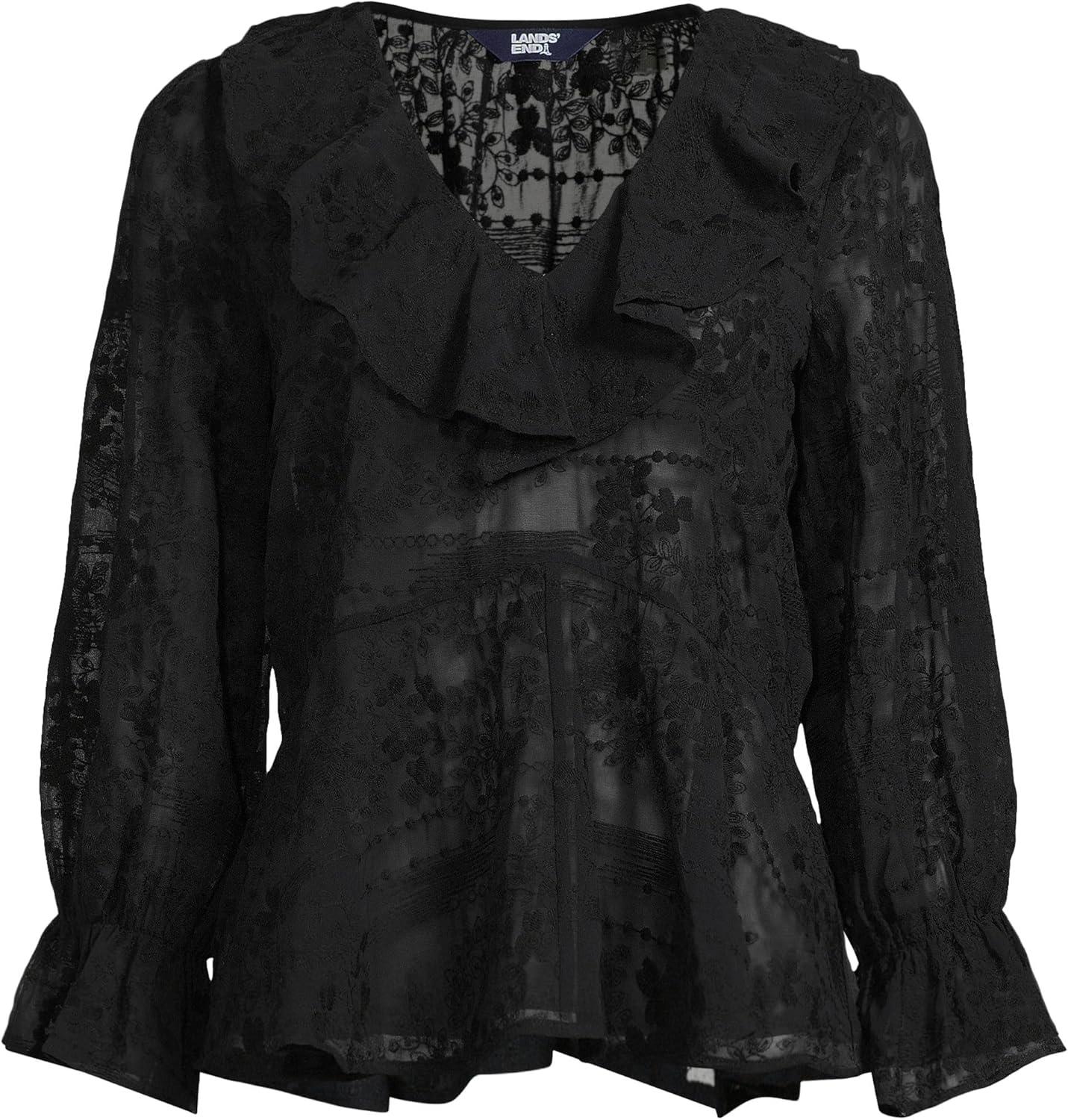 Lands’ End Women’s Feminine Ruffle Chiffon V Neck Blouse(Black)