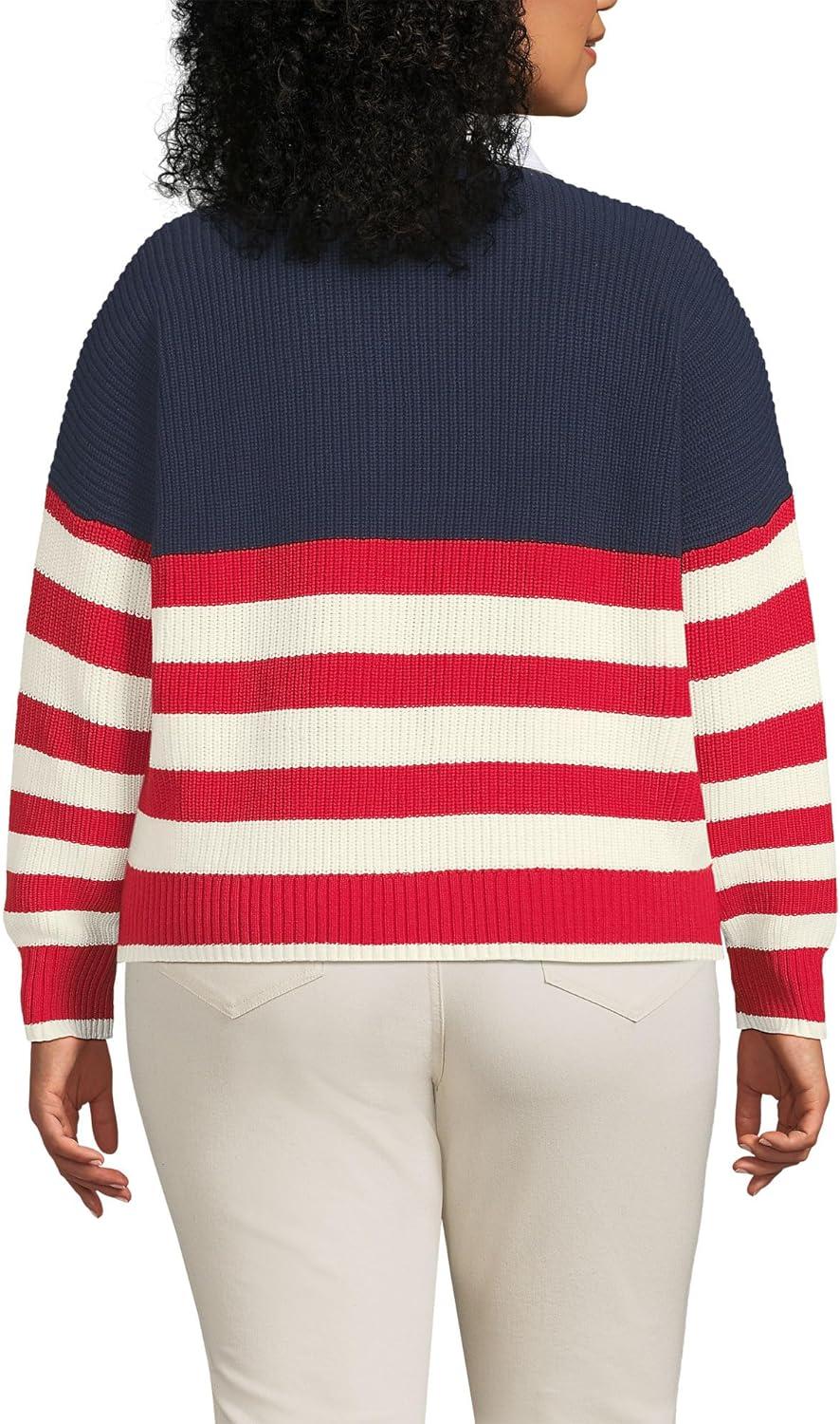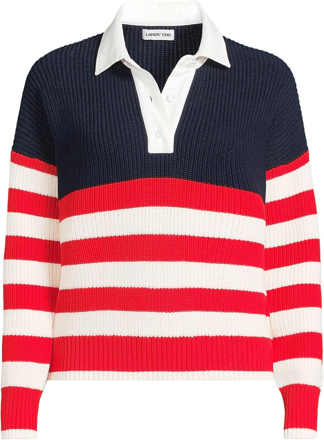 Lands’ End Women’s Drifter Rugby with Woven Collar Sweater(Red/Ivory American Flag)