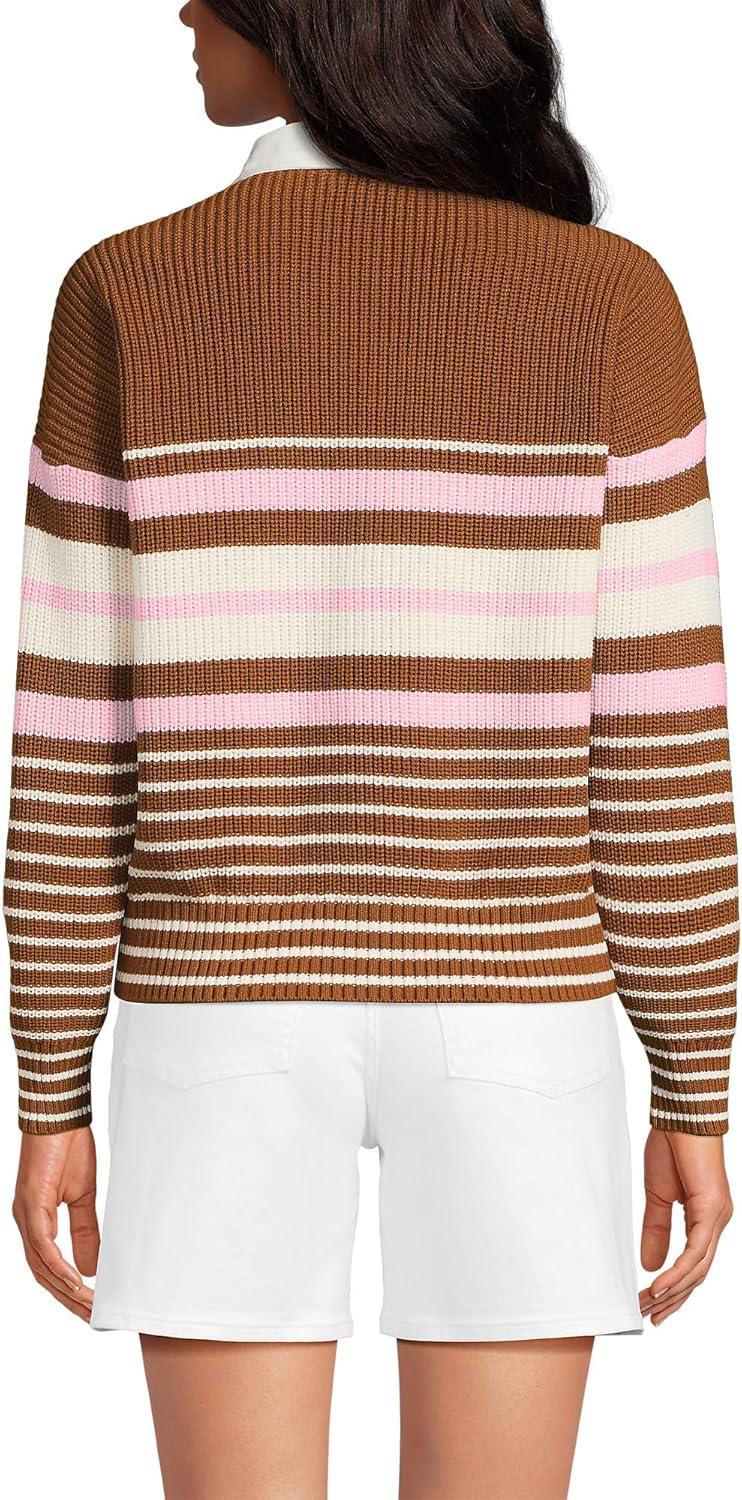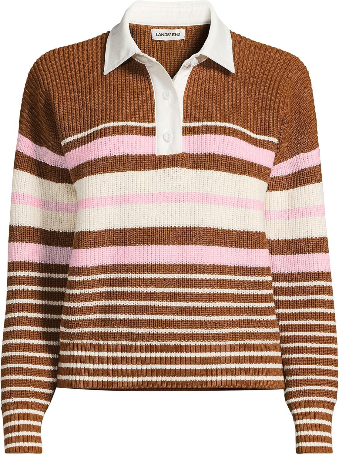 Lands’ End Women’s Drifter Rugby with Woven Collar Sweater(Rich Ginger Multi Stripes)