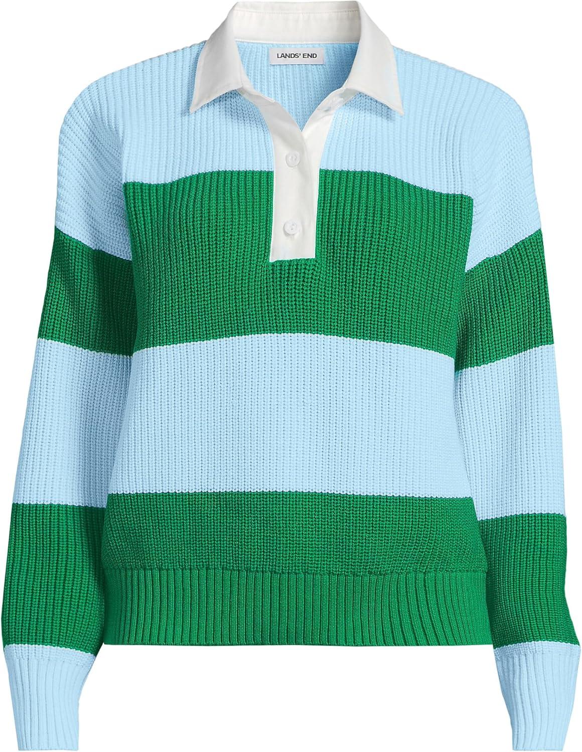 Lands’ End Women’s Drifter Rugby with Woven Collar Sweater(True Green/Soft Ice Blue Rugby)