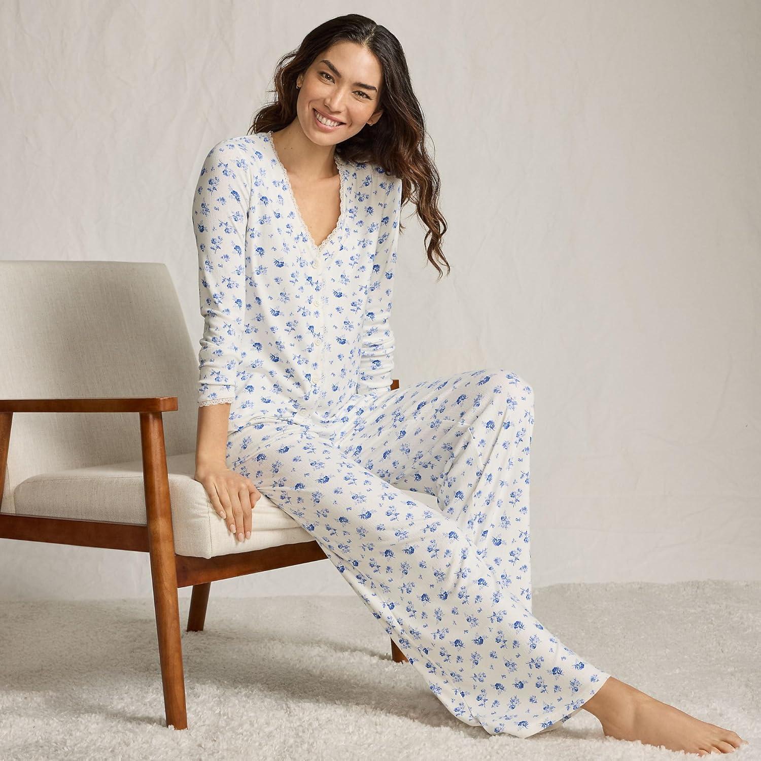 Lands’ End Women’s Pointelle Long Sleeve Sleep Cardigan(Ivory/Blue Dainty Floral)