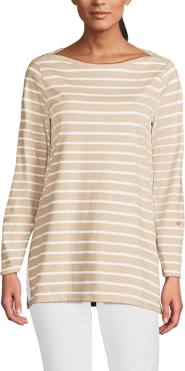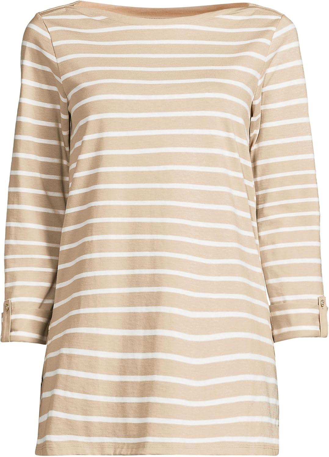 Lands’ End Women’s American-Grown Supima Cotton Adjustable 3/4 Sleeve Boatneck Tunic(Champagne/Ivory Breton Stripe)