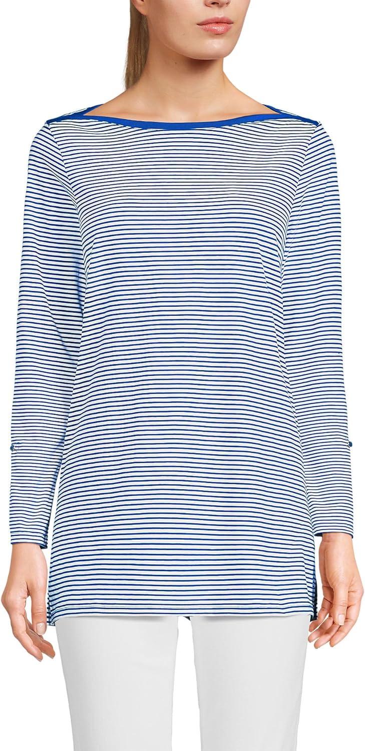 Lands’ End Women’s American-Grown Supima Cotton Adjustable 3/4 Sleeve Boatneck Tunic(Cobalt/Ivory Micro Stripe)