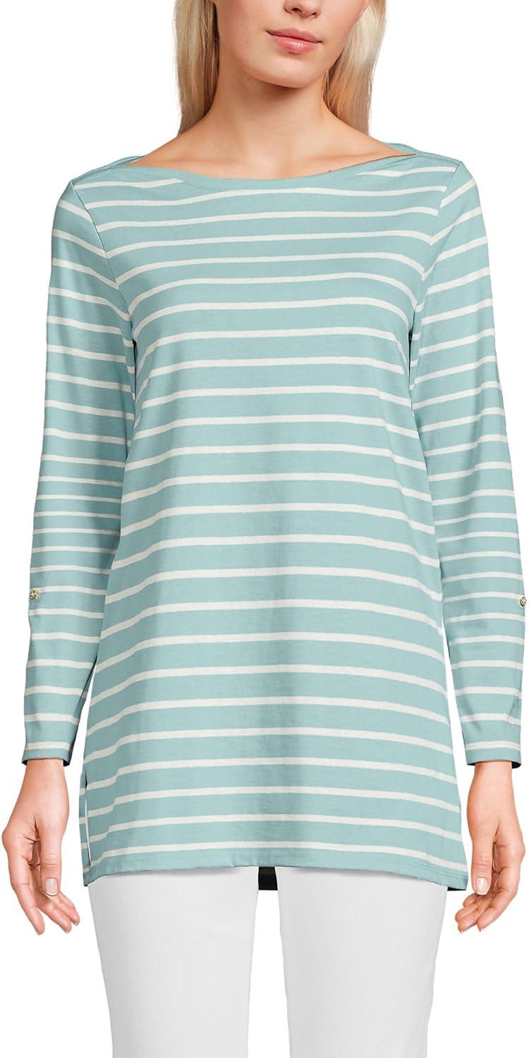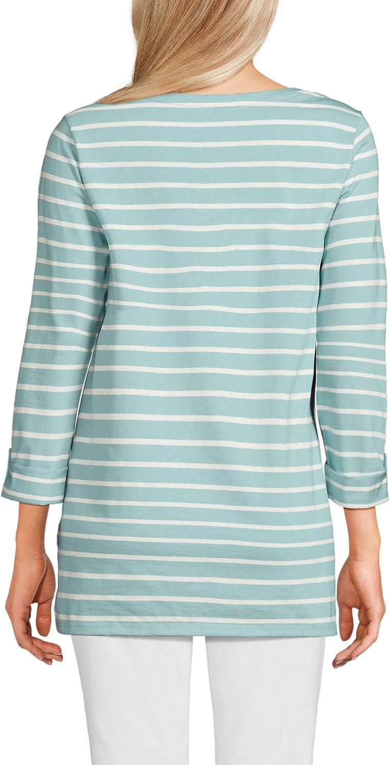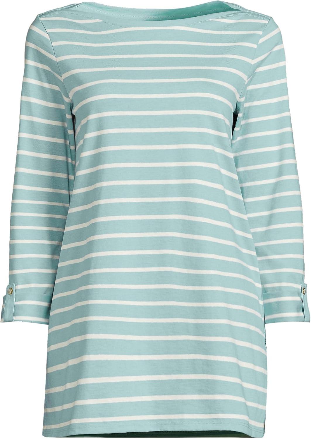 Lands’ End Women’s American-Grown Supima Cotton Adjustable 3/4 Sleeve Boatneck Tunic(Misty Aqua/Ivory Breton Stripe)