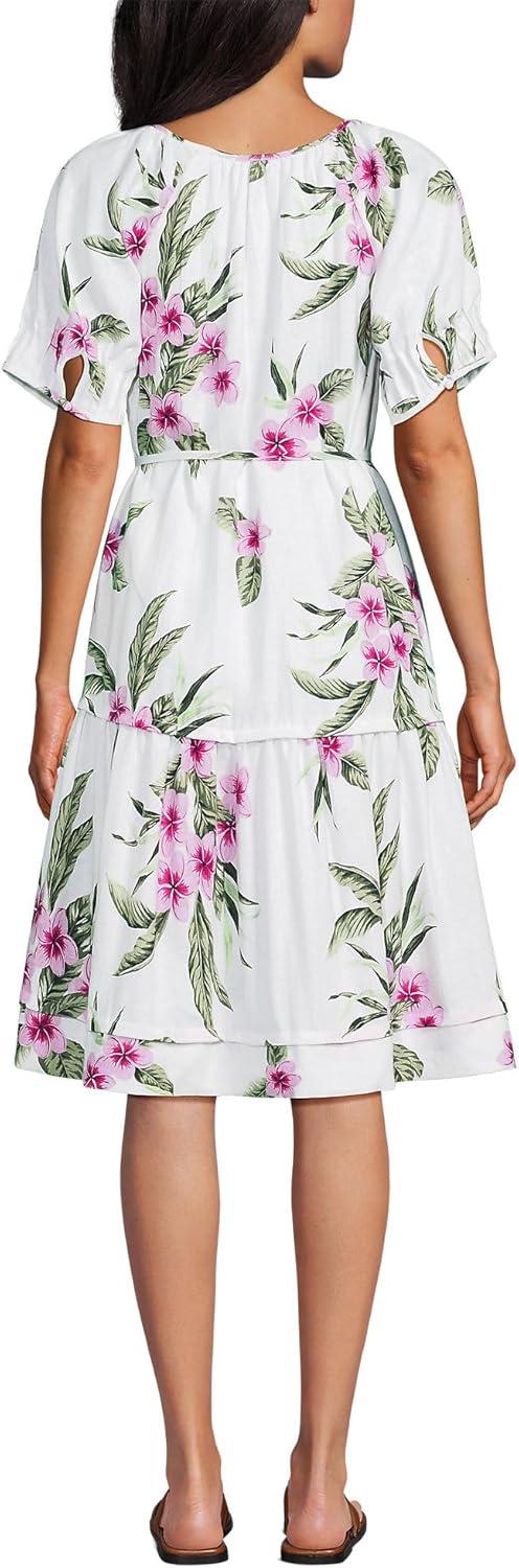 Lands’ End Women’s Puff Sleeve Pleated Linen Knee Length Dress(White/Magenta Plumeria)