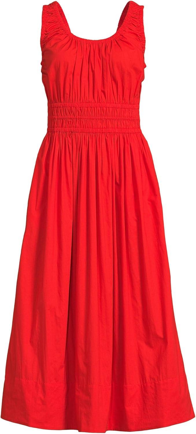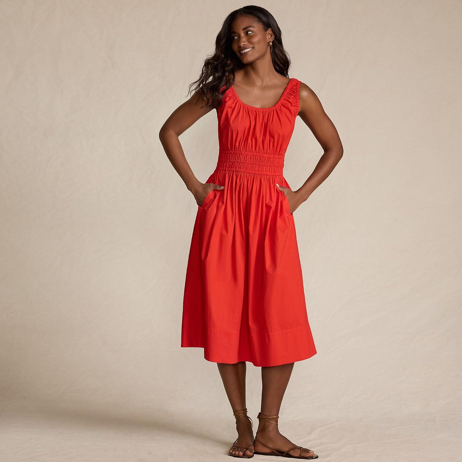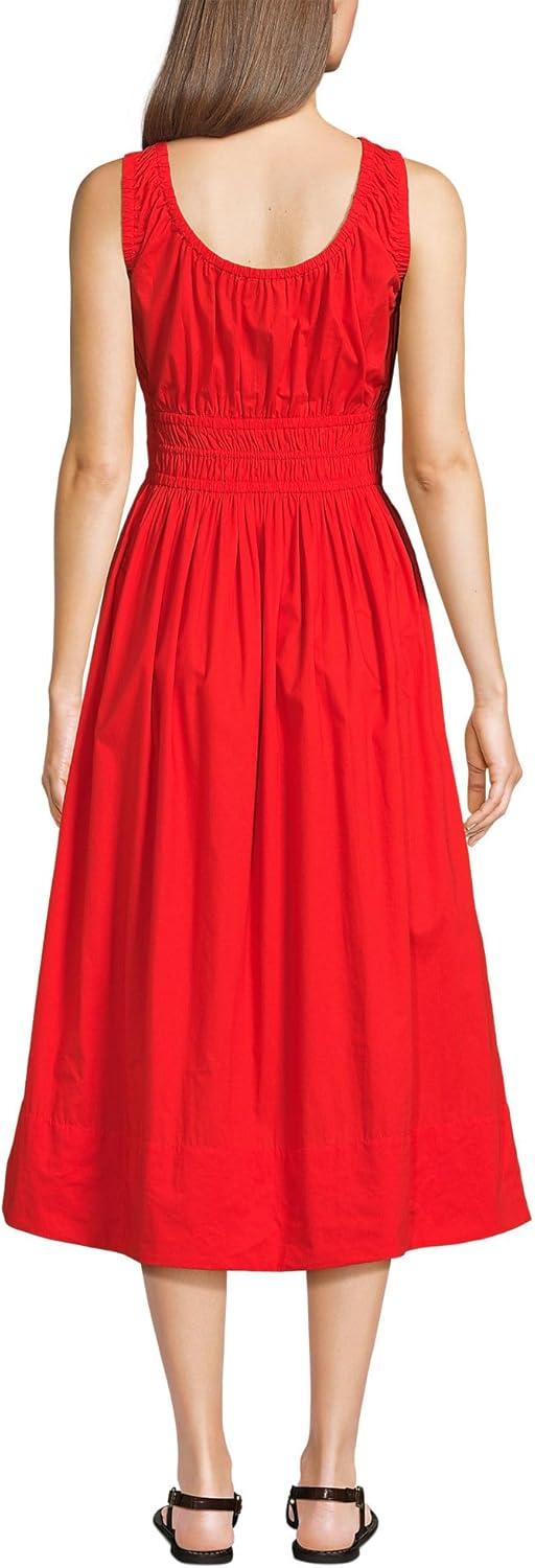 Lands’ End Women’s Sleeveless Poplin Smocked Midi Dress(Coral Red)