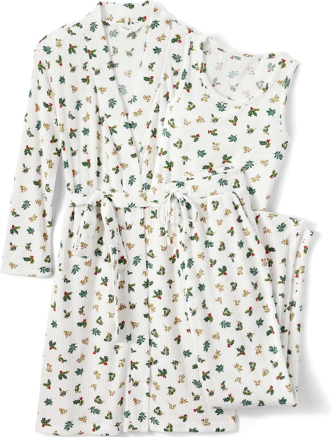 Lands’ End Women’s Brushed Cozy Waffle Jersey 3 Piece Pajama Set – Tank Top Pant and Robe(Ivory Holly)