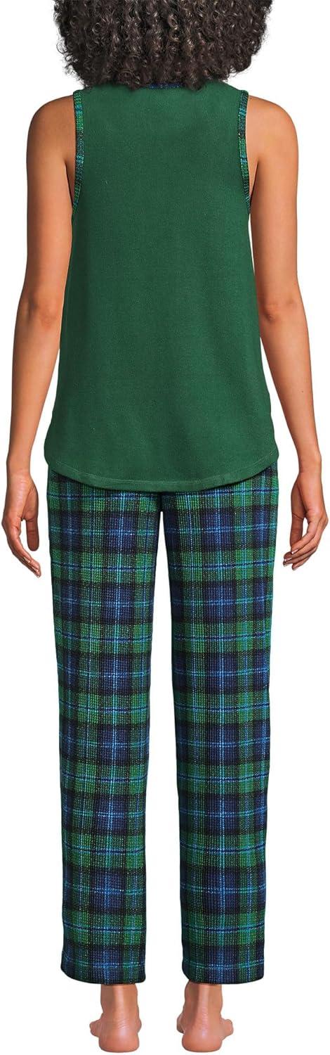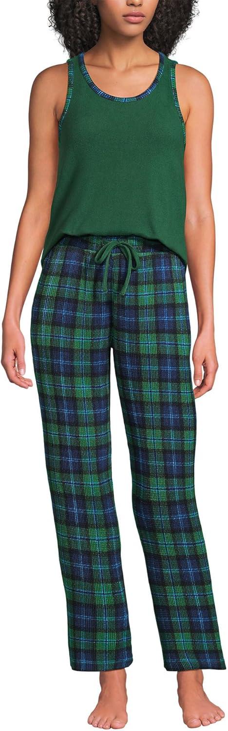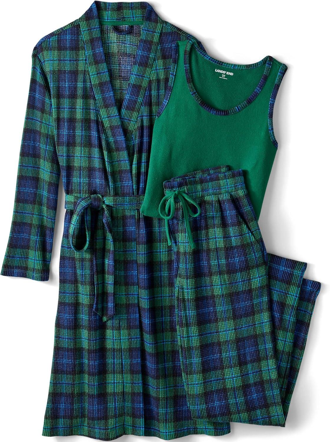 Lands’ End Women’s Brushed Cozy Waffle Jersey 3 Piece Pajama Set – Tank Top Pant and Robe(Light Emerald Blackwatch)