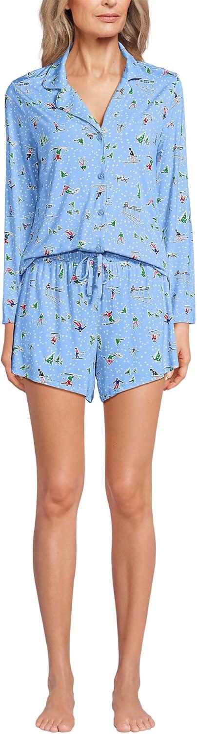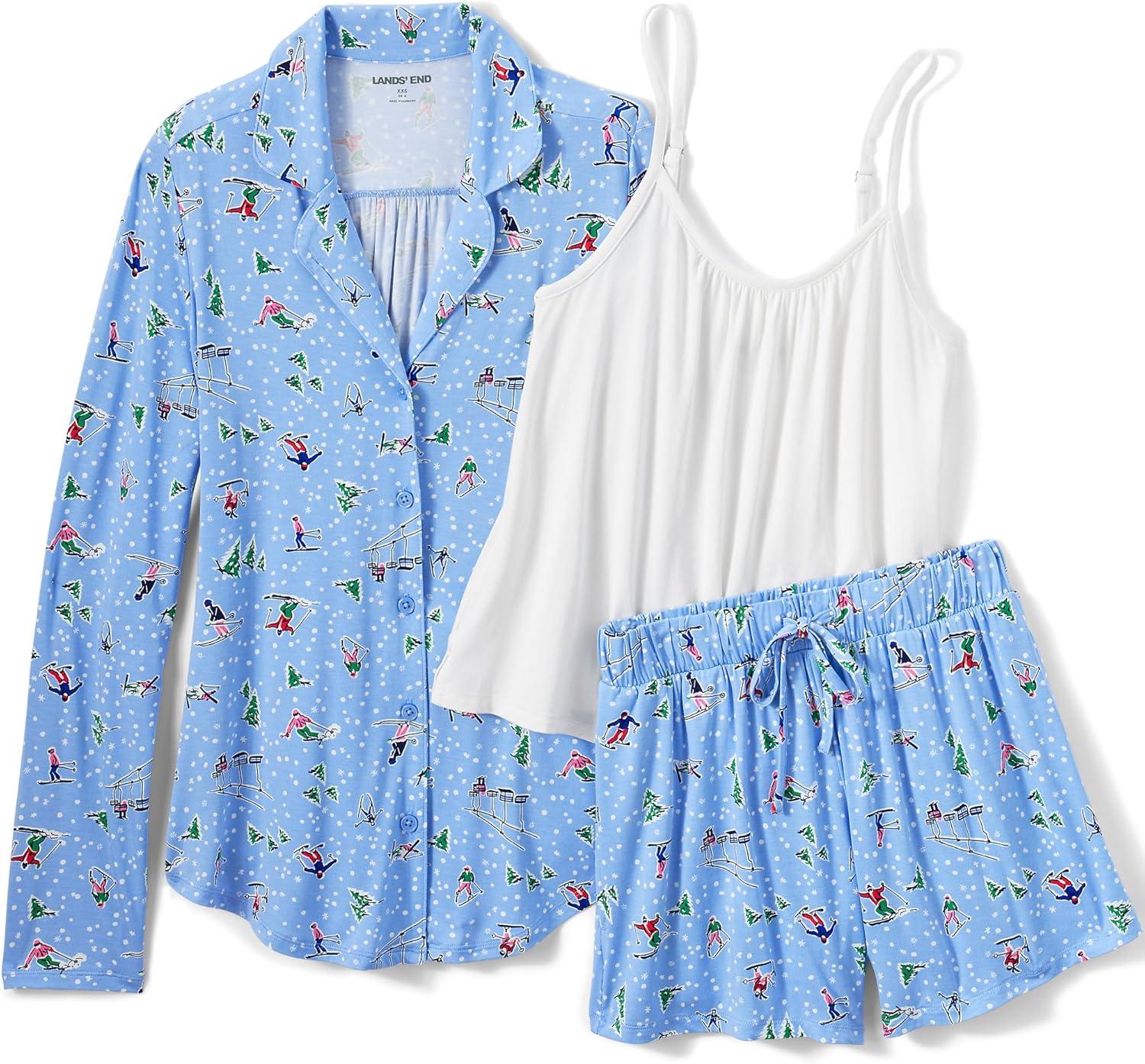 Lands’ End Women’s Cooling 3 Piece Pajama Set – Long Sleeve Top Cami and Shorts(Clear Blue Sky Skiers)