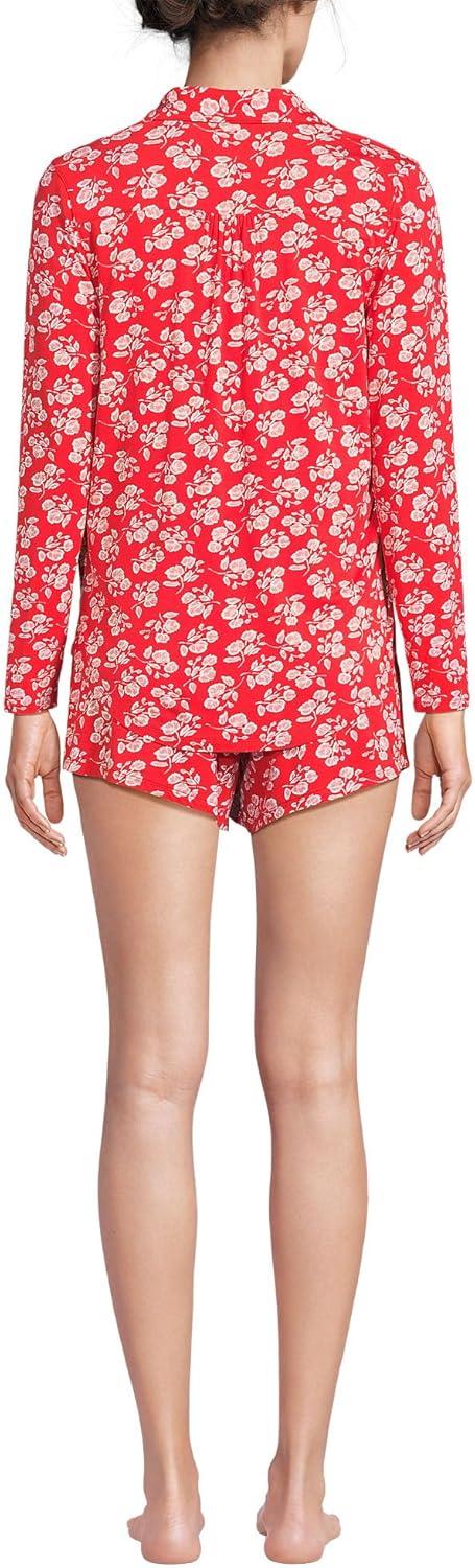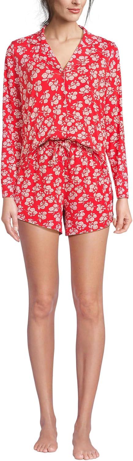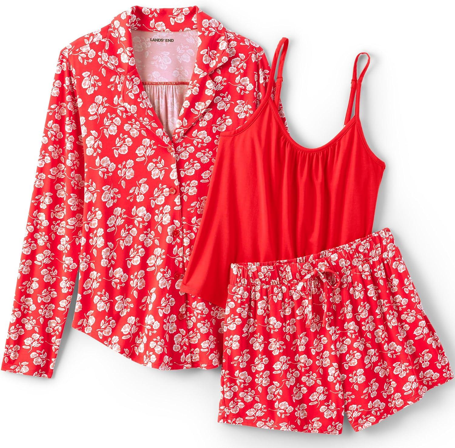 Lands’ End Women’s Cooling 3 Piece Pajama Set – Long Sleeve Top Cami and Shorts(Coral Red Blooms)