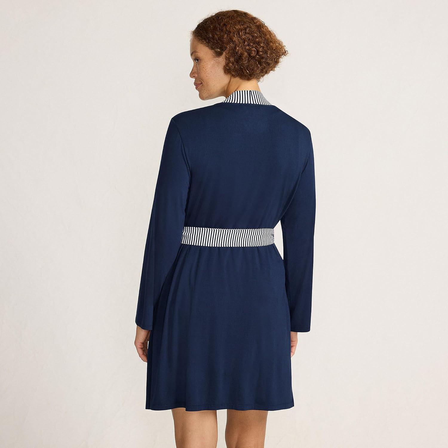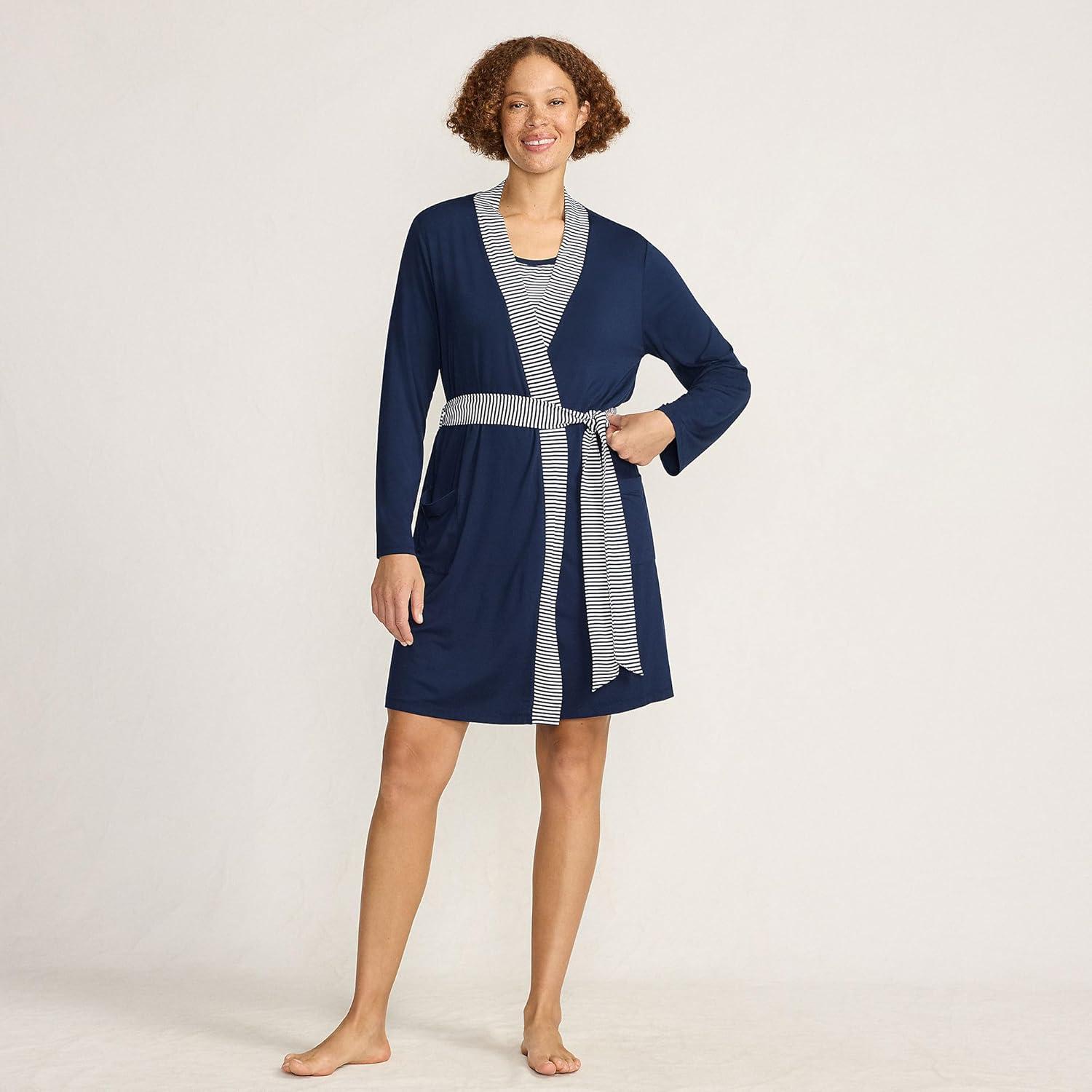 Lands’ End Women’s Cooling 3 Piece Pajama Set – Robe Tank and Shorts(Deep Sea Navy Mini Stripe)