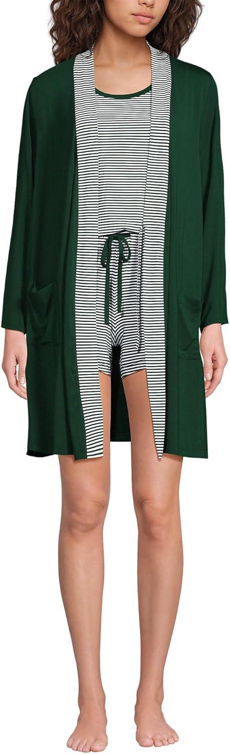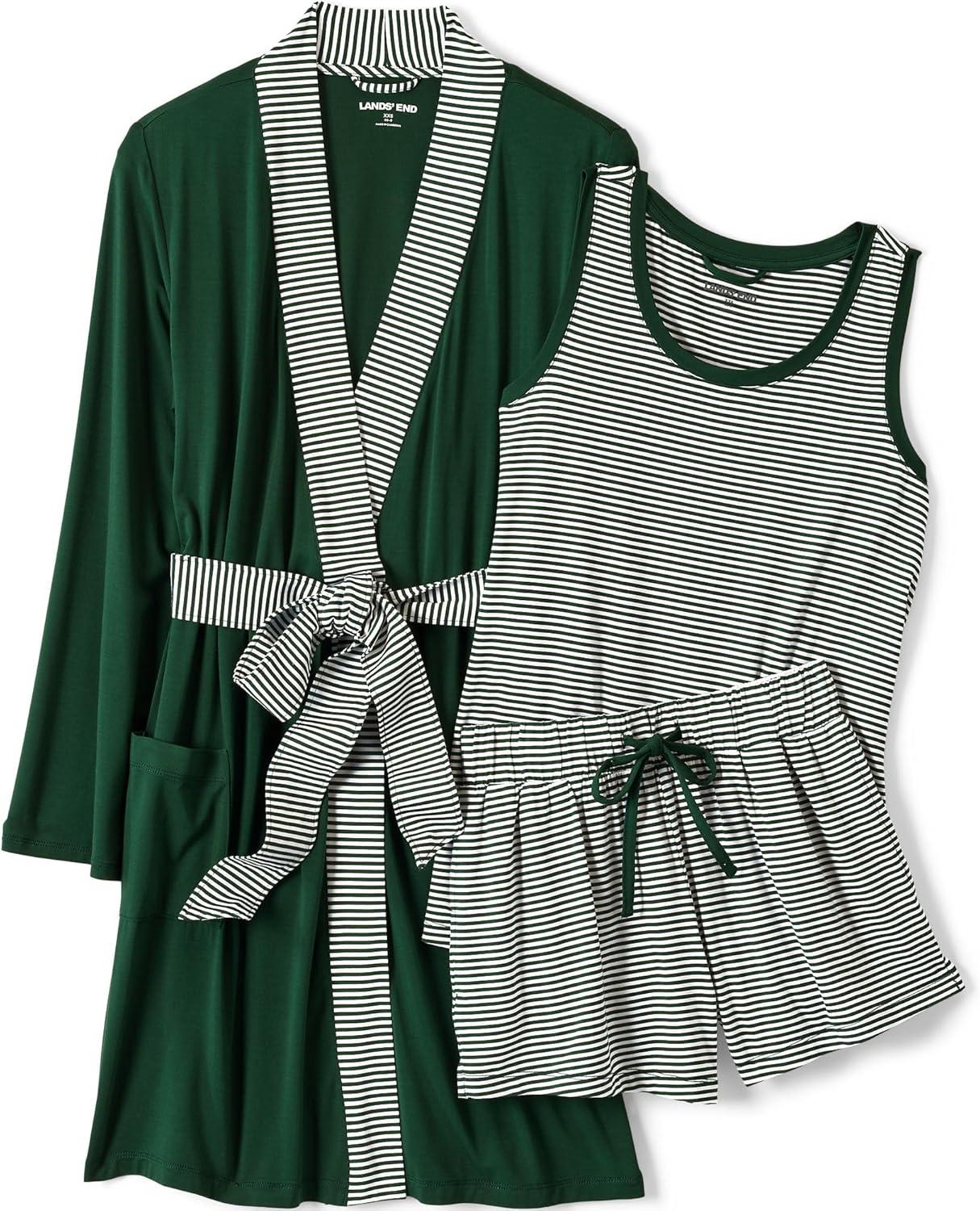 Lands’ End Women’s Cooling 3 Piece Pajama Set – Robe Tank and Shorts(Pine Valley Mini Stripe)