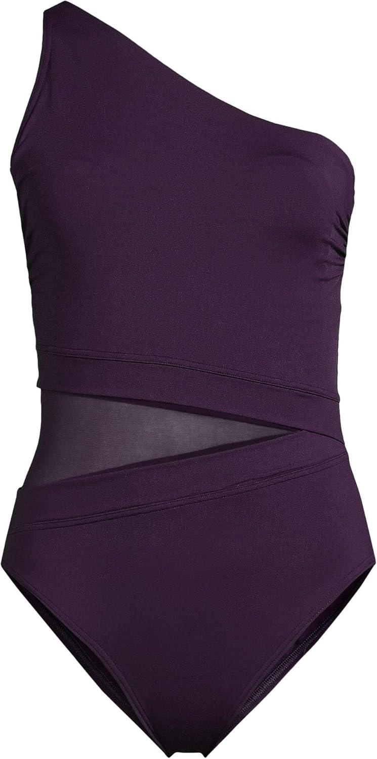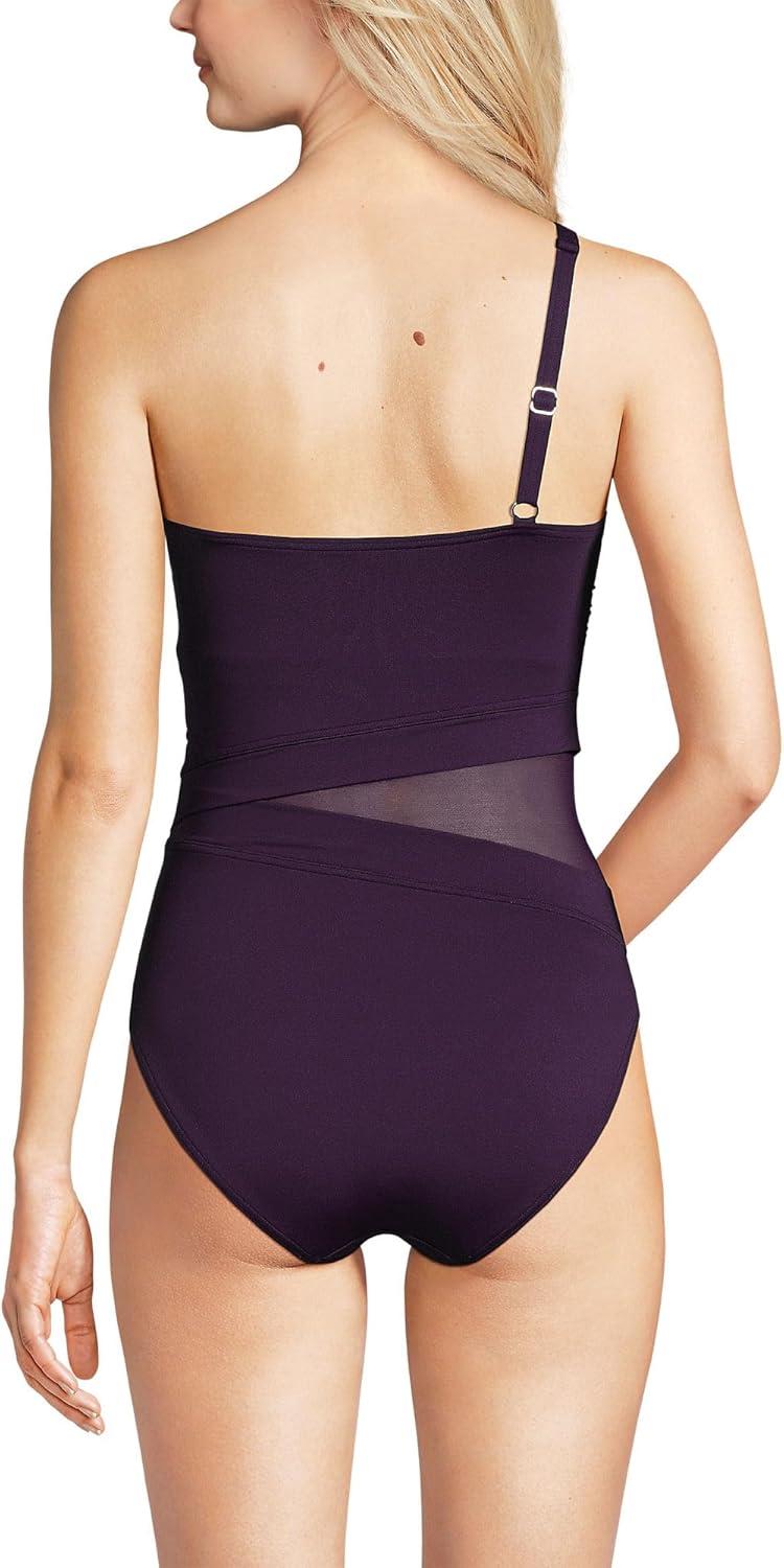• Lands’ End Women’s Chlorine Resistant Smoothing Control Mesh High Leg One Shoulder One Piece Swimsuit(Blackberry)