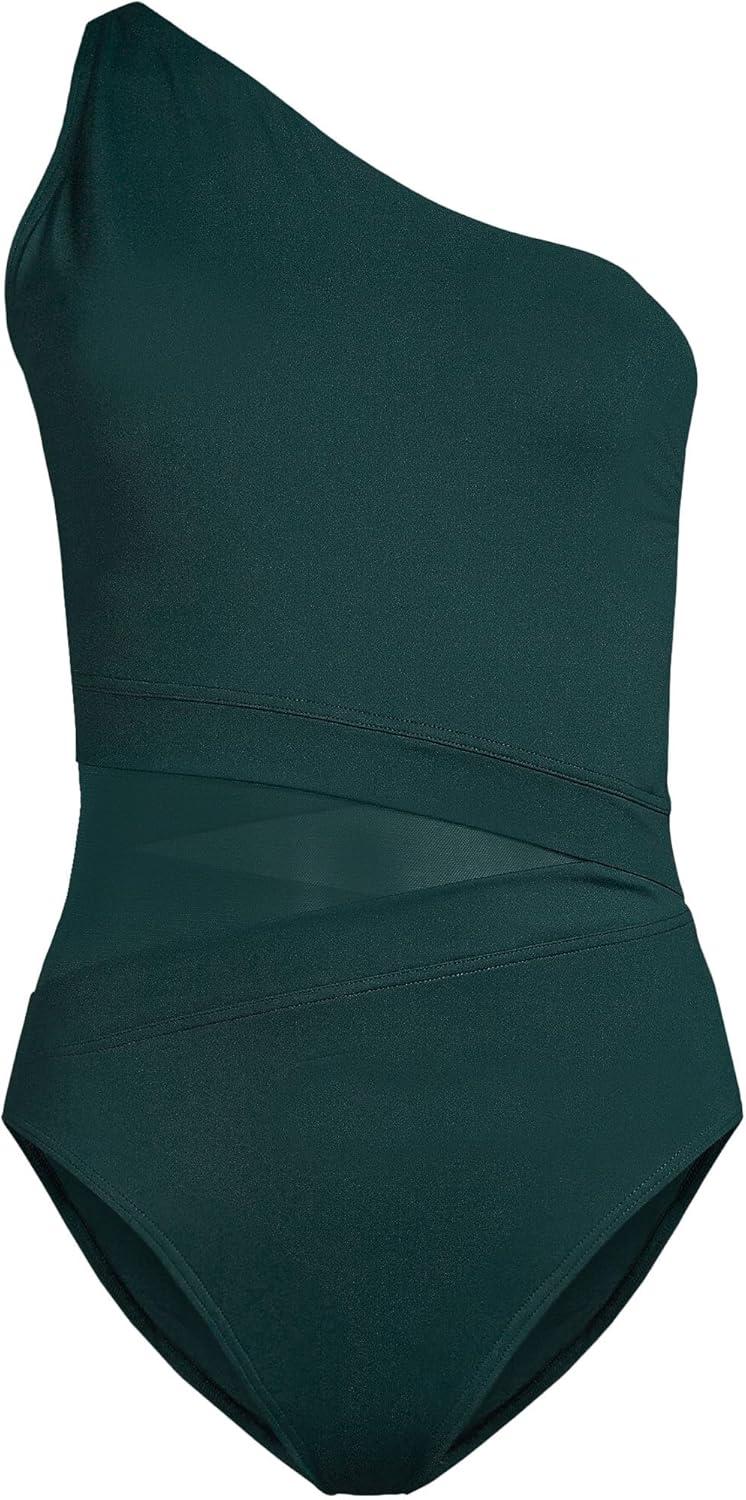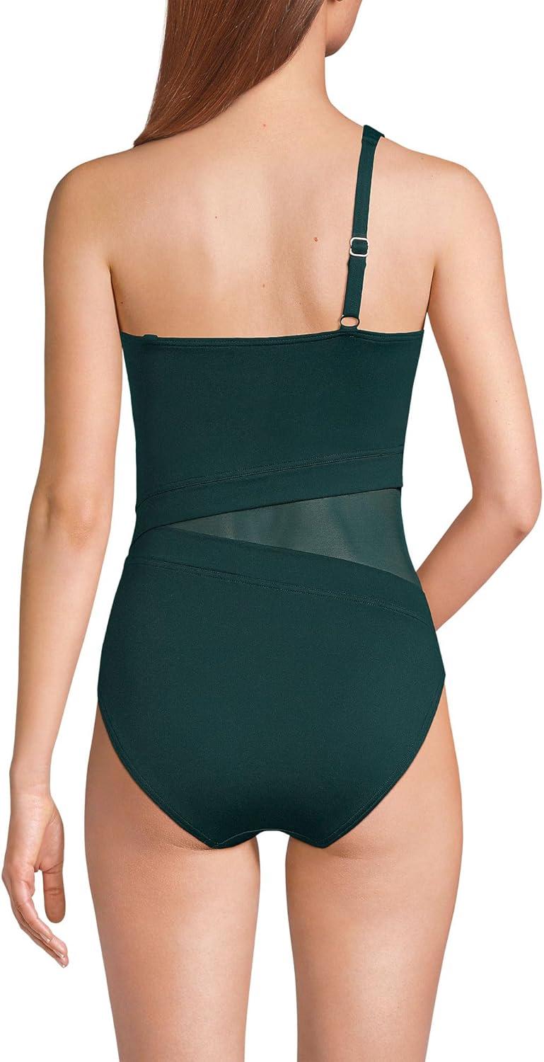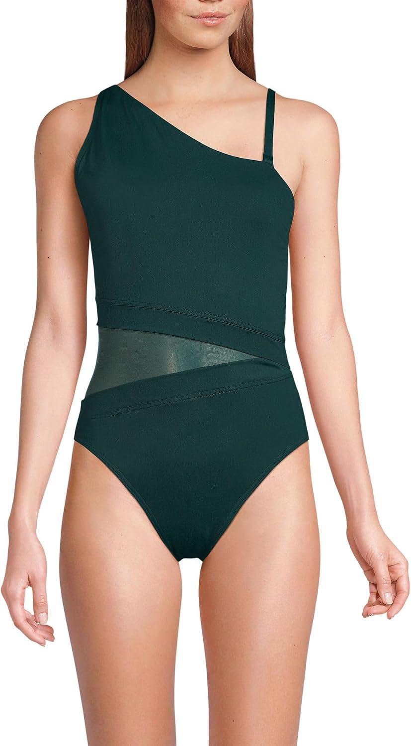 • Lands’ End Women’s Chlorine Resistant Smoothing Control Mesh High Leg One Shoulder One Piece Swimsuit(Deep Balsam)