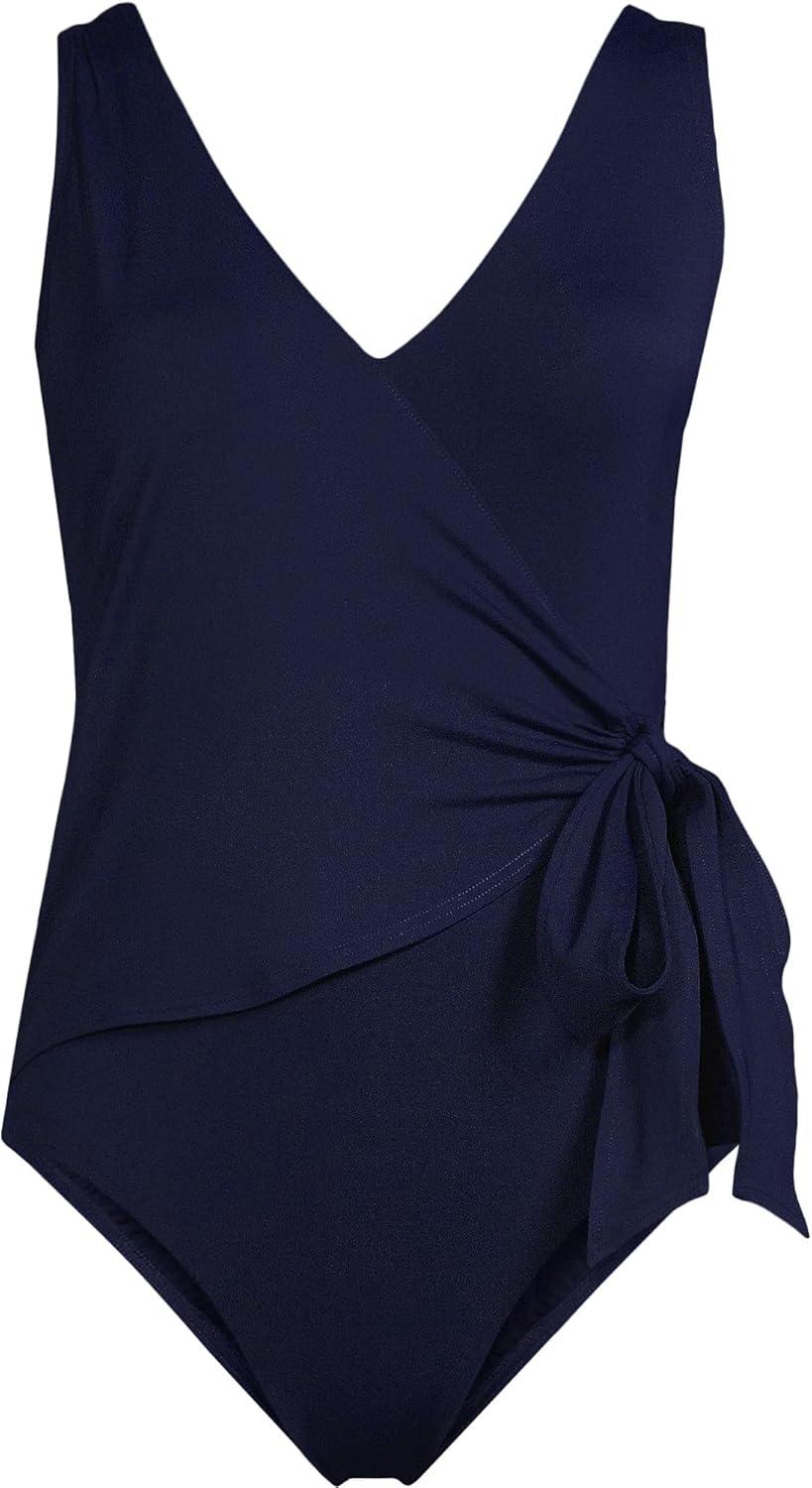 • Lands’ End Women’s Chlorine Resistant Side Tie Wrap High Leg One Piece Swimsuit(Deep Sea Navy)