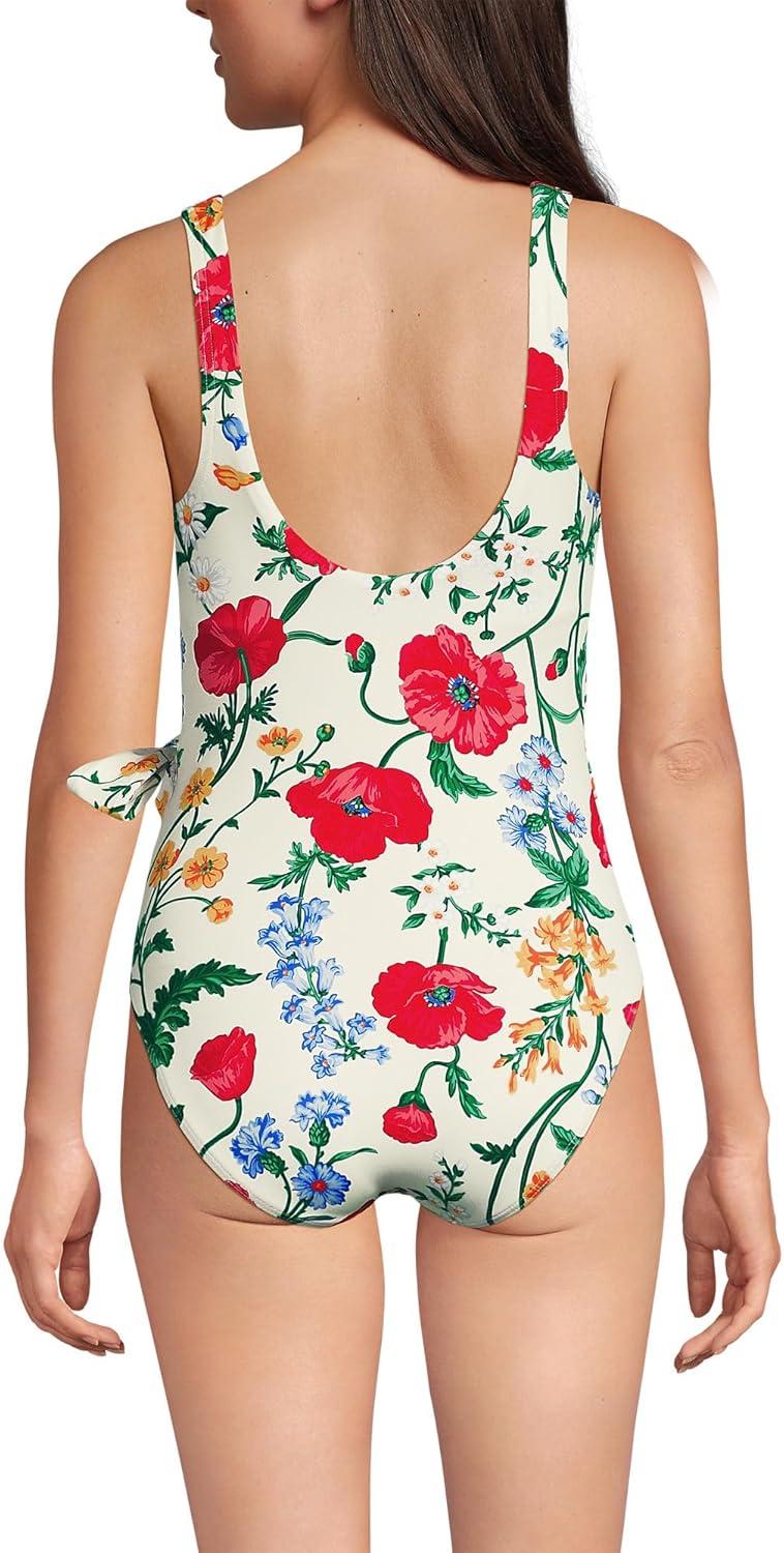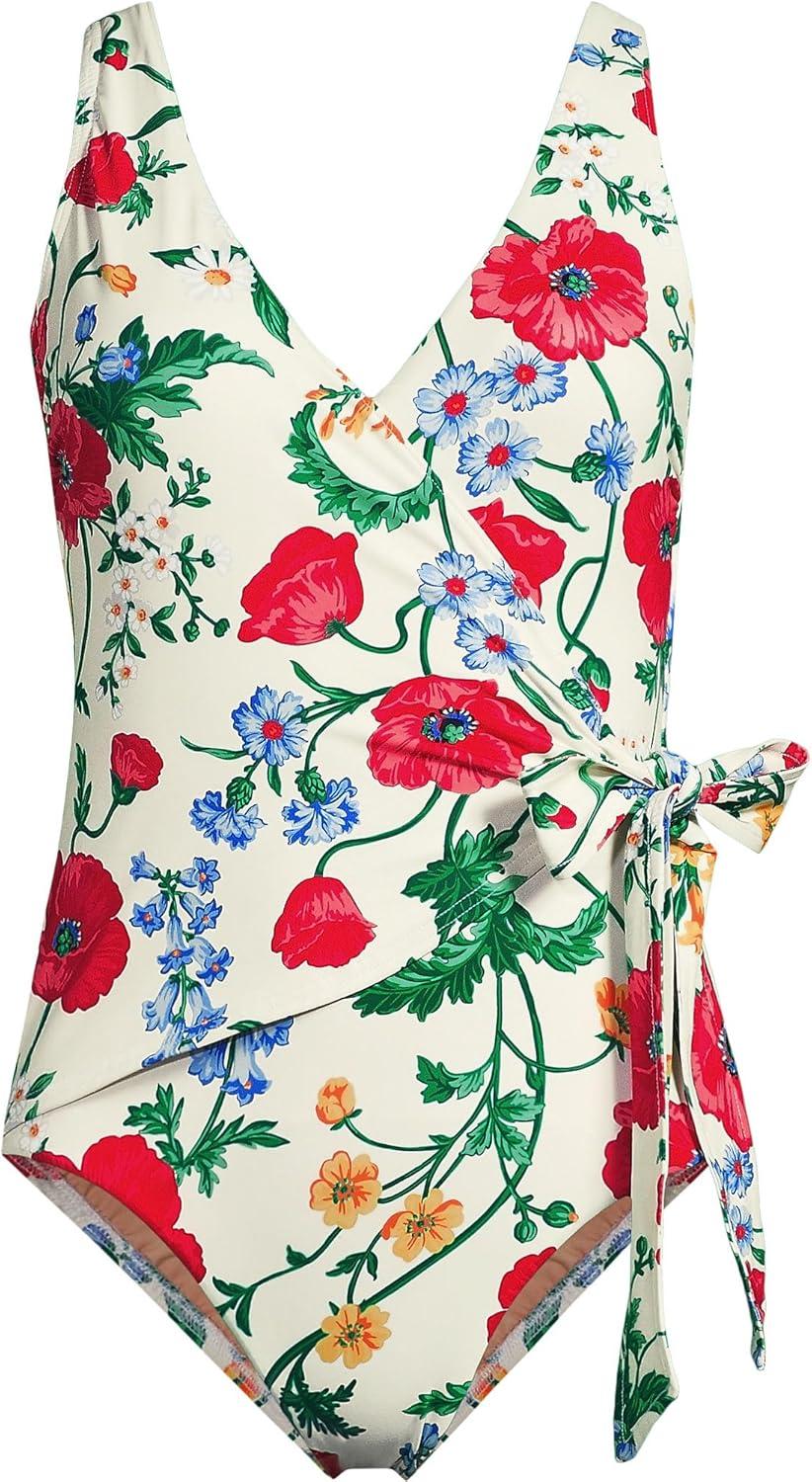 • Lands’ End Women’s Chlorine Resistant Side Tie Wrap High Leg One Piece Swimsuit(Egret/Exploded Poppy Floral)