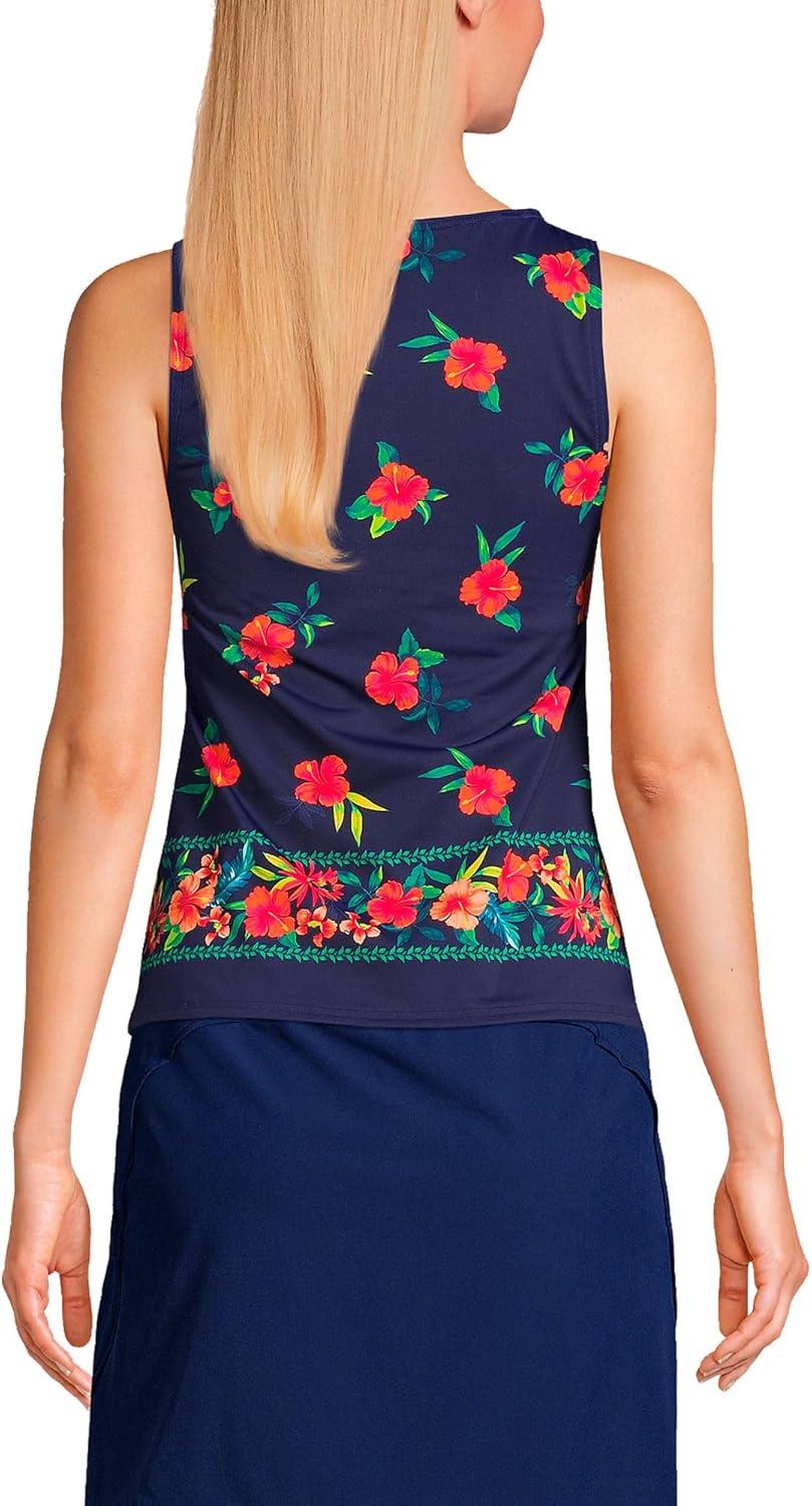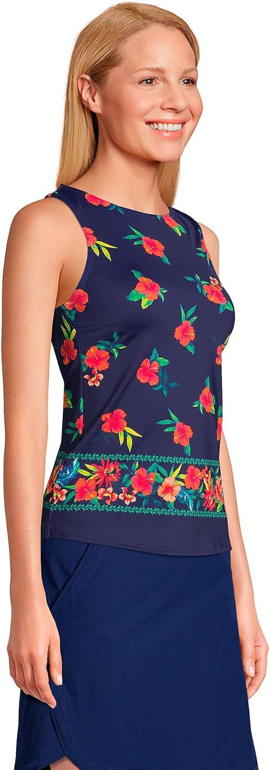 Lands’ End Women’s High Neck UPF 50 Modest Tankini Top Swimsuit(Navy Tropical Scenic Border)