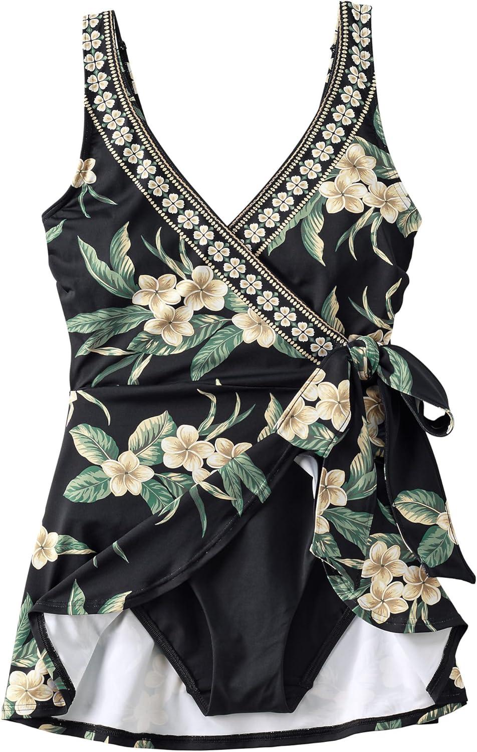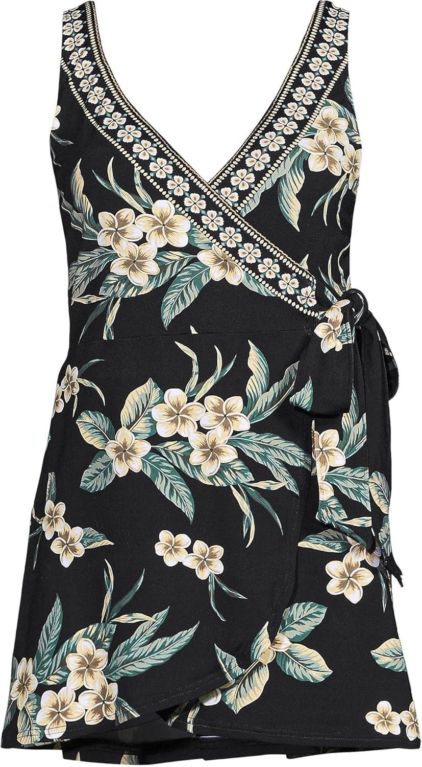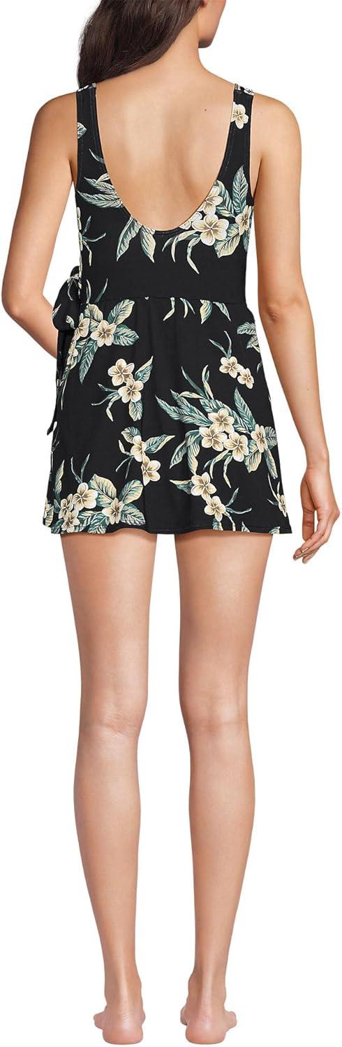 Lands’ End Women’s Side Tie Mini Swim Dress Swimsuit(Black Plumeria Border)