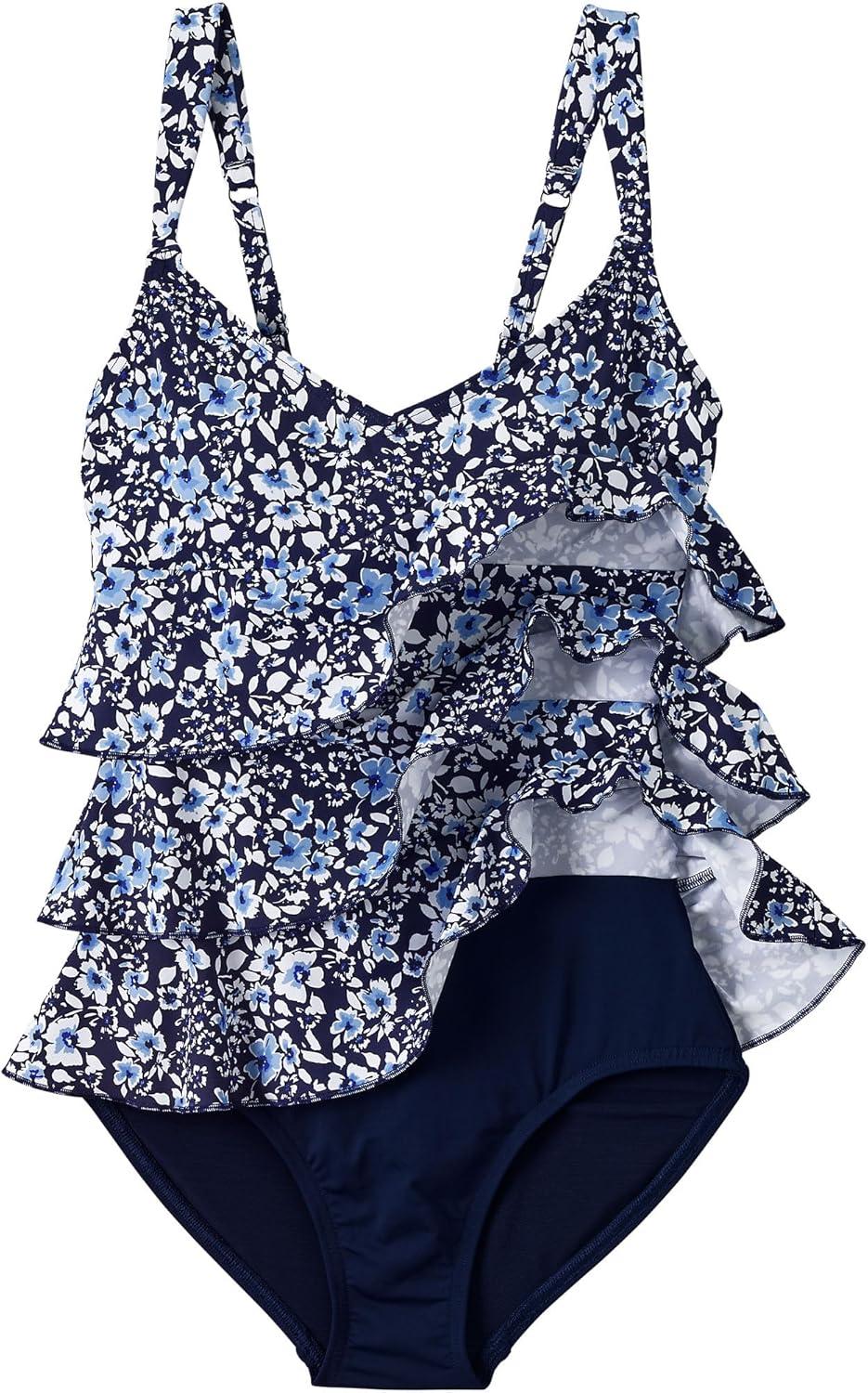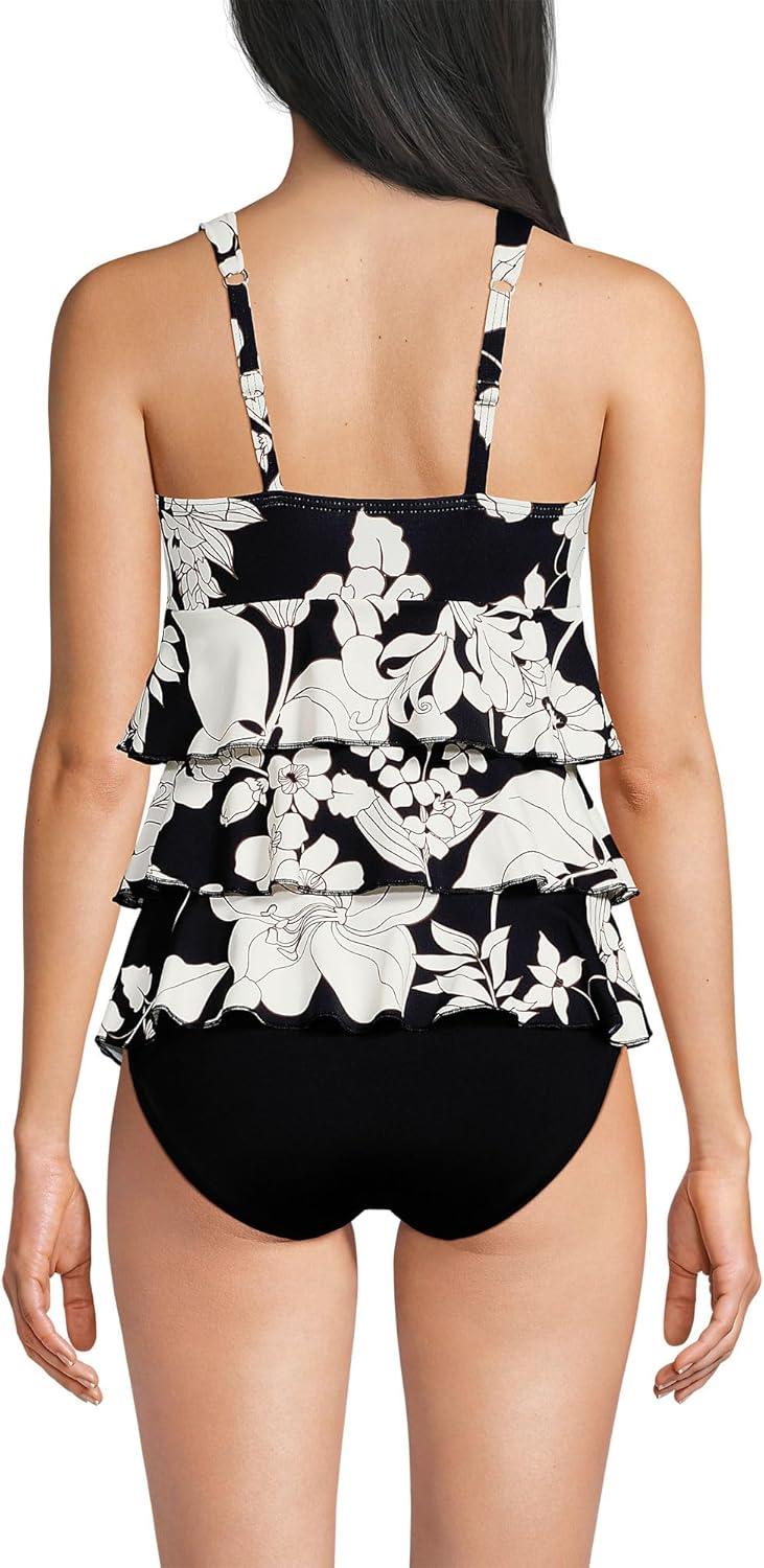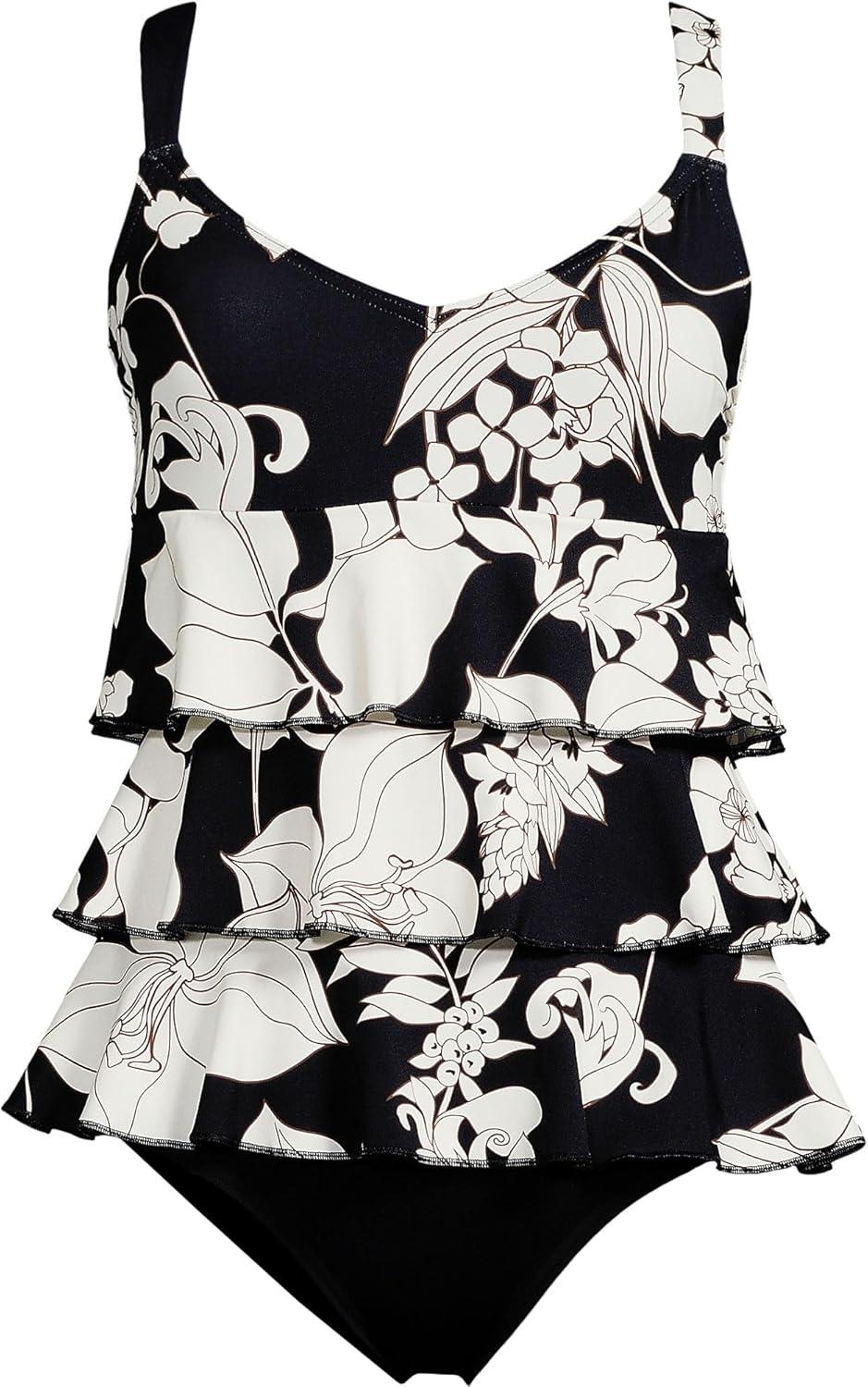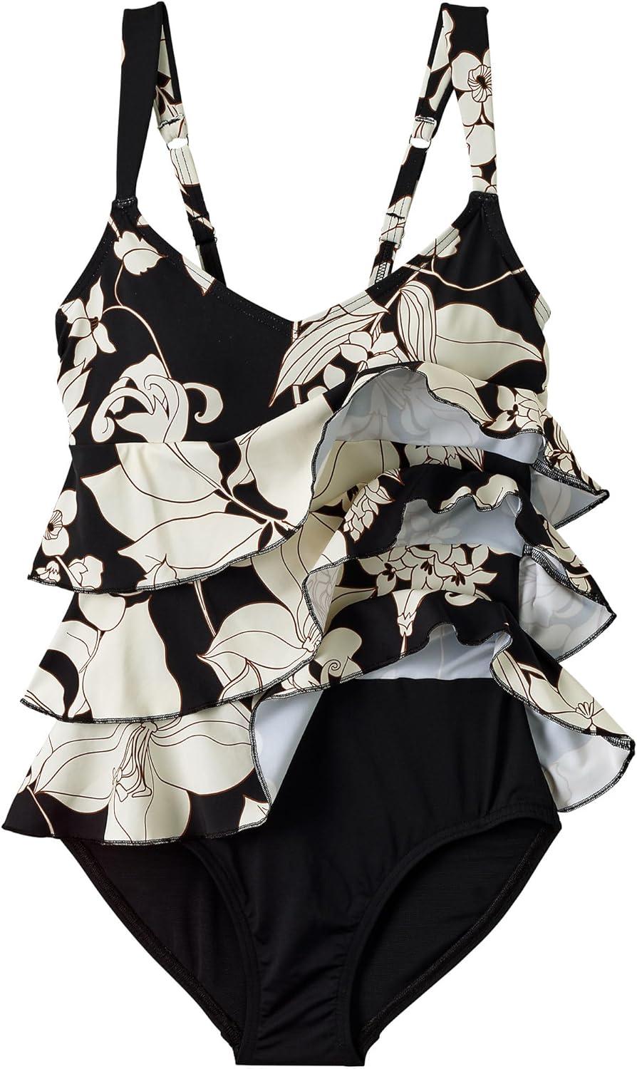Lands’ End Women’s Smoothing Control Ruffle Fauxkini One Piece Swimsuit(Black/Egret Lilies)