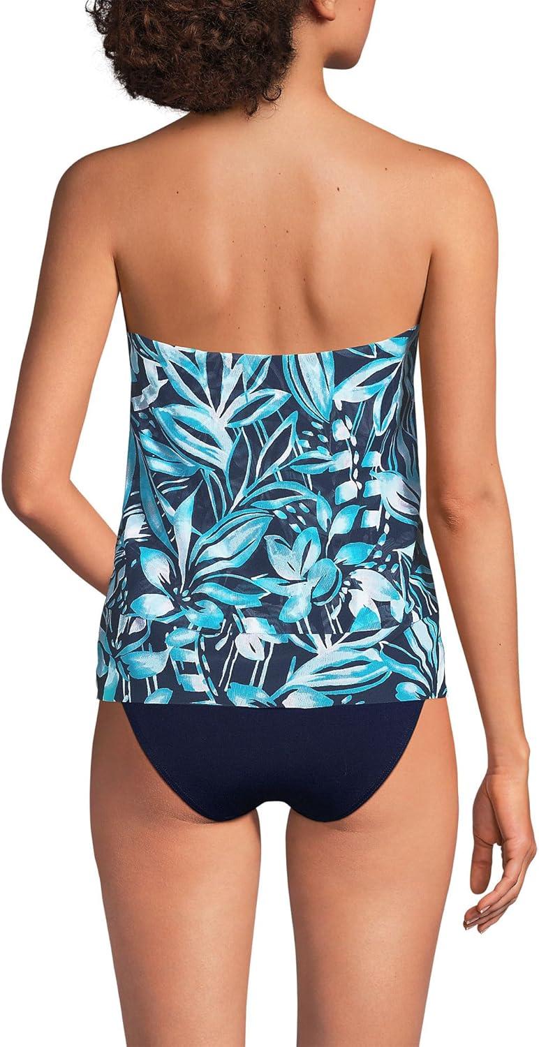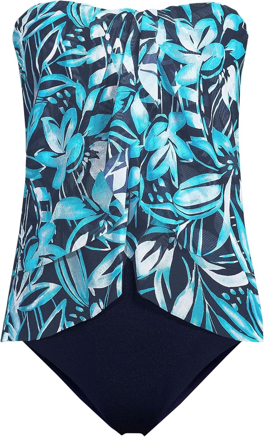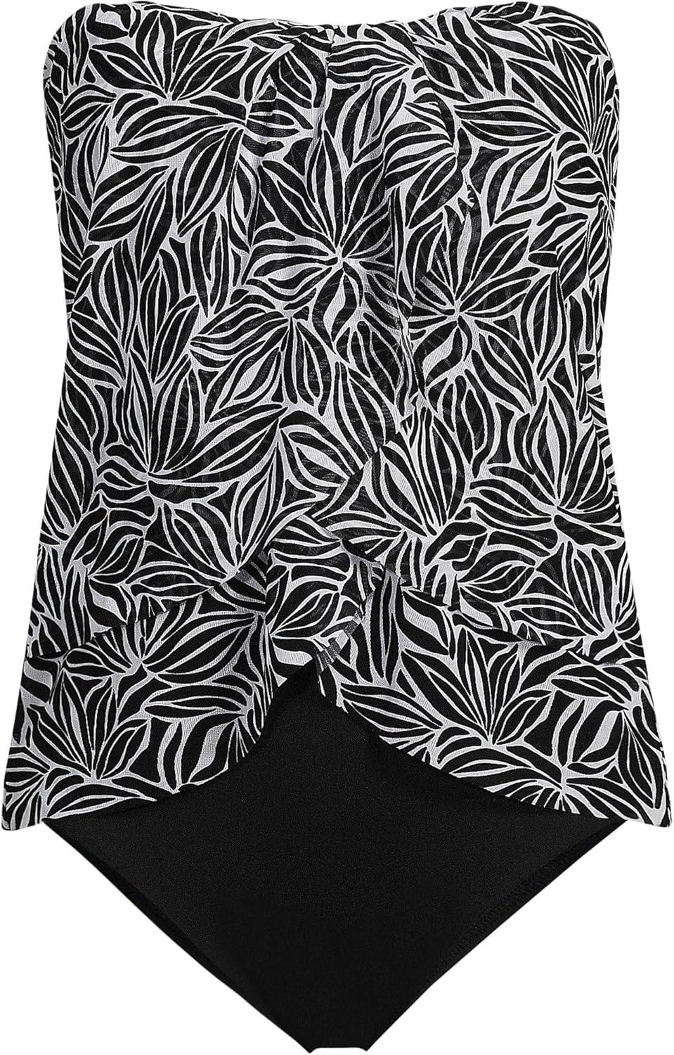 • Lands’ End Women’s Chlorine Resistant Mesh Bandeau High Leg Fauxkini One Piece Swimsuit(Black/White Abstract Floral)