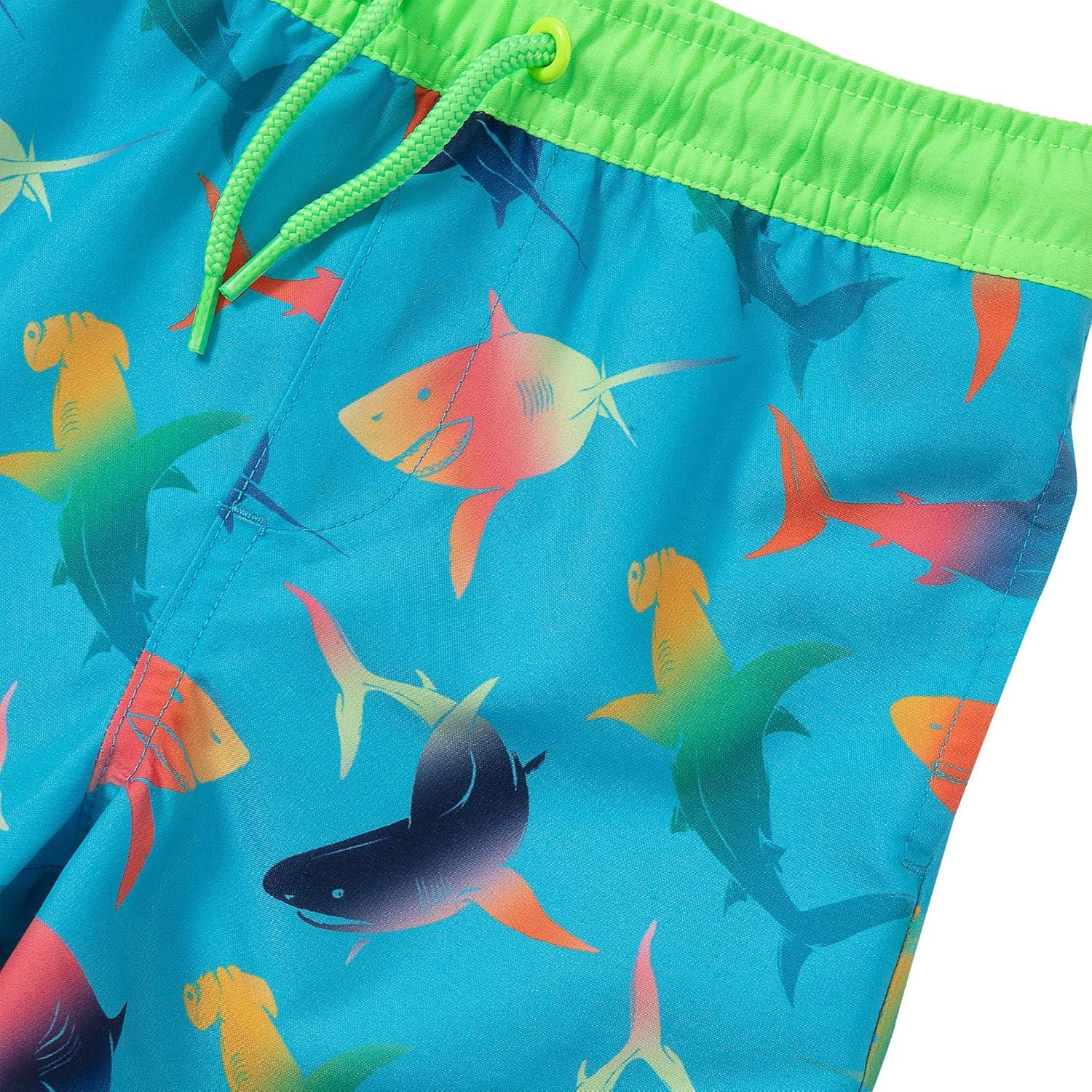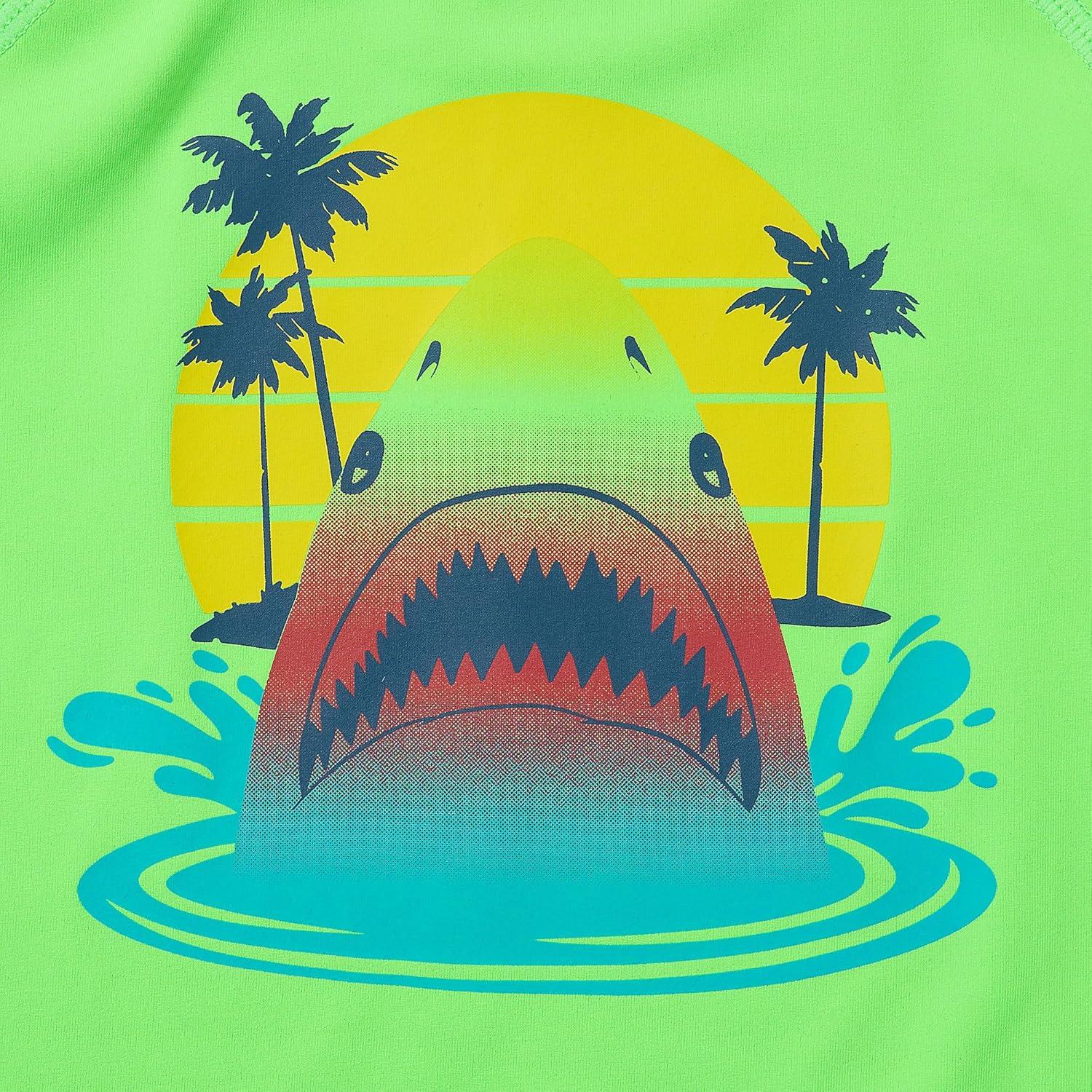 Lands’ End Boys Chlorine Resistant Short Sleeve UPF 50 Rash Guard Swim Trunk Set(Neon Green Sharks)