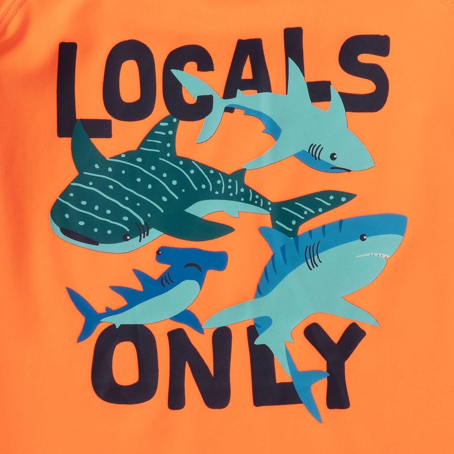 Lands’ End Boys Chlorine Resistant Short Sleeve UPF 50 Rash Guard Swim Trunk Set(Neon Orange Squiggle Sharks)