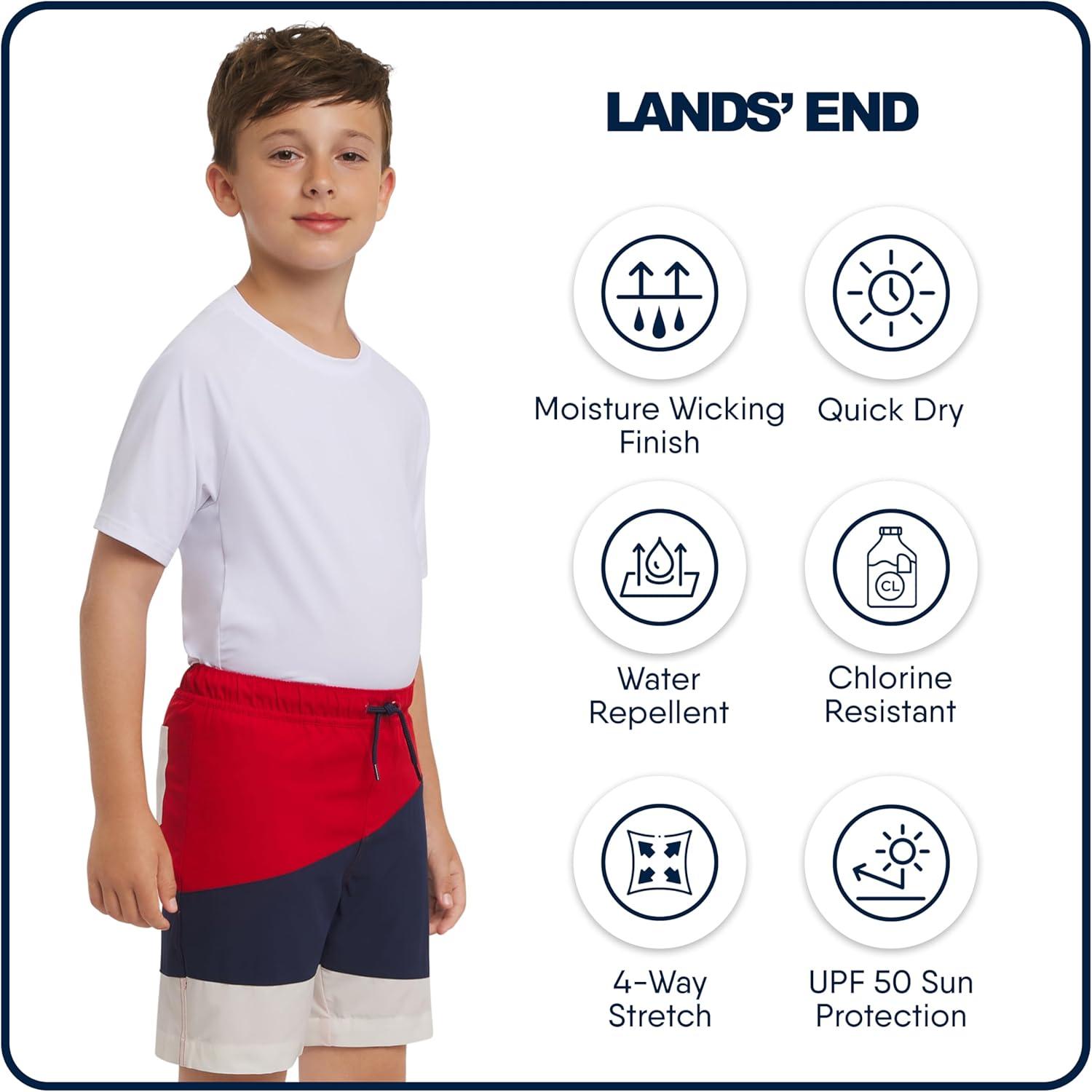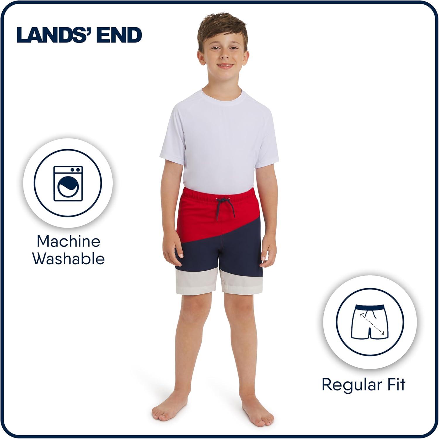 Let your little one make a splash in style and comfort with the Lands' End Boys' Swim Trunks. Designed with the brand's signature focus on both comfort and style, these quick-drying swim shorts are crafted to look good and feel even better. Whether he's building sandcastles on the beach, diving into the pool, or enjoying backyard water fun, these swim trunks provide the perfect blend of functionality and style, ensuring he's ready for any aquatic adventure. Experience premium quality with these chlorine-resistant swim trunks. The lightweight polyester shell and comfortable lining provide a super-soft feel that kids will love, while the stretchable waistband with drawstring ensures a secure and customizable fit. Convenient pockets add a touch of practicality, allowing him to keep small essentials close at hand. These swim trunks aren't just about comfort; they also offer UPF 50 sun protection, shielding him from harmful UV rays and keeping him safe during sunny days. These boys' swim trunks are designed with a regular fit and a 6″ inseam, providing comfortable all-day wear. Available in sizes Small, Medium, Large, and X-Large, they cater to a range of growing boys. For a more relaxed, roomier fit, consider sizing up. And when it's time for cleanup, these low-maintenance swim trunks are machine washable, making laundry a breeze. Simply toss them in the wash, and they'll be ready for their next water adventure. Combining premium quality, sun protection, and effortless care, these Lands' End swim trunks are the perfect choice for boys who love to make a splash.