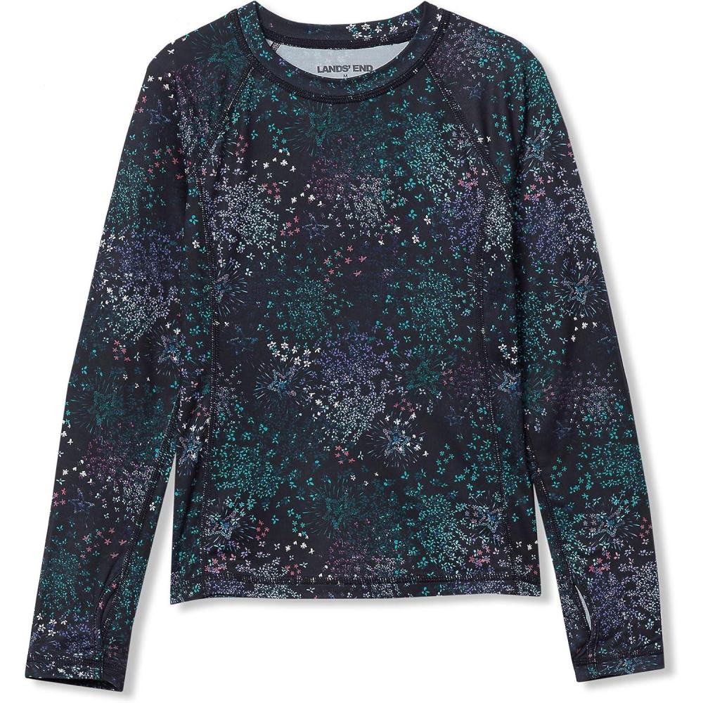 Lands’ End Girls Thermal Base Layer Long Underwear Thermaskin Crew Neck Shirt(Black Starburst Floral)