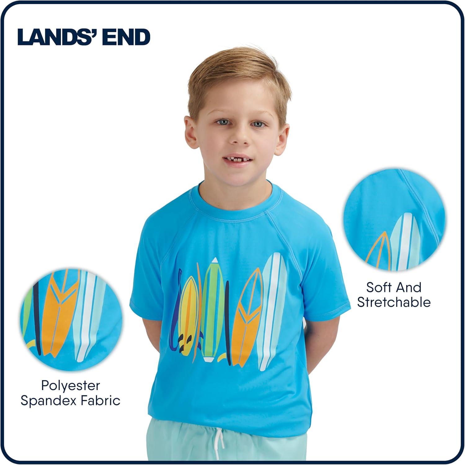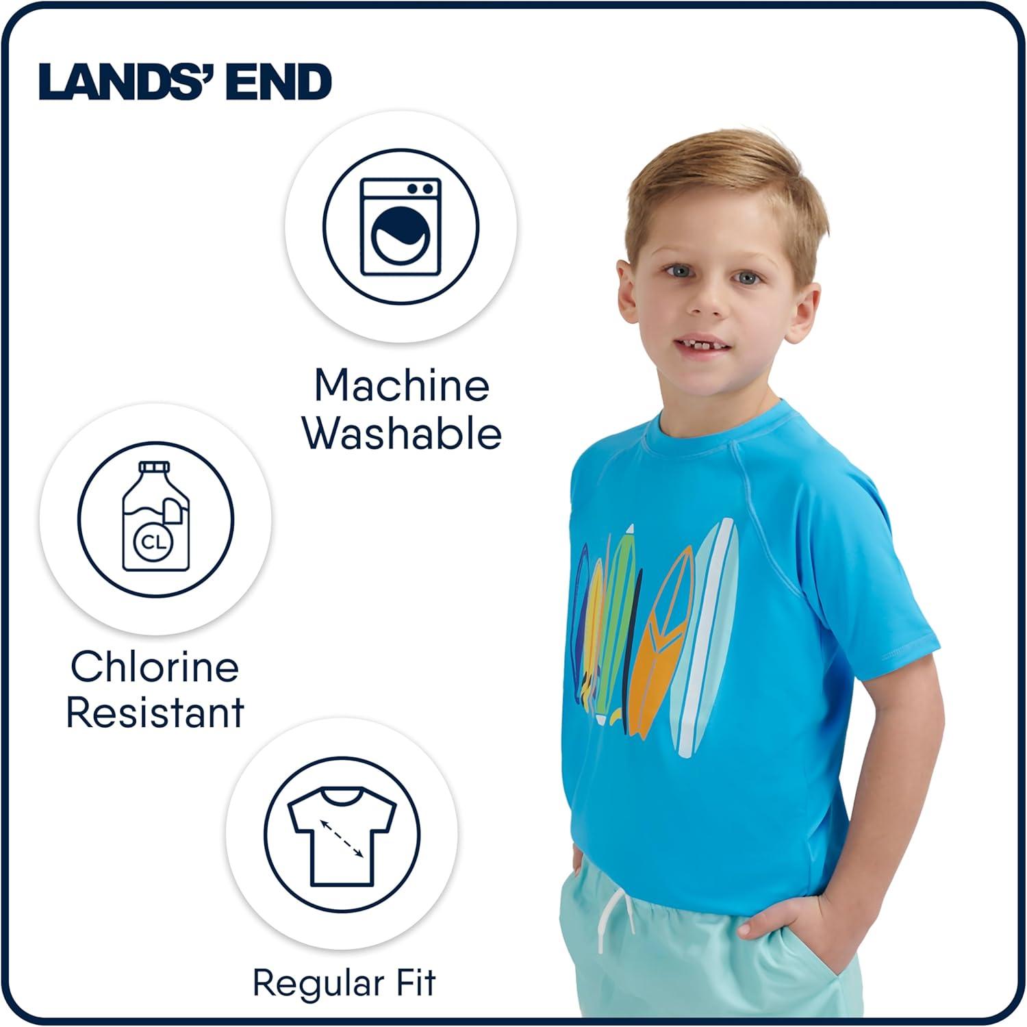 Prepare your children for endless fun in the sun with the Lands’ End Kids’ Rash Guard Shirt. This essential piece of swimwear combines the brand's signature comfort and style, offering a super soft and stretchable design for quick-drying comfort and reliable sun protection. Ideal for swimming, surfing, or simply playing outdoors, this rash guard keeps your kids comfortable and protected, whether they're at the pool, beach, or enjoying backyard water play. Its versatile design and vibrant colors make it a favorite for any water activity. Crafted with premium quality materials, this short-sleeve rash guard ensures exceptional comfort and durability. The moisture-wicking and chlorine-resistant polyester-spandex fabric delivers lightweight comfort, allowing for unrestricted movement in and out of the water. The soft and stretchy material feels gentle against the skin, while maintaining its shape and color even after repeated exposure to chlorine and sun. With built-in UPF 50 sun protection, this rash guard provides essential shielding from harmful UV rays, allowing your children to enjoy their outdoor adventures with confidence. Designed for convenience and ease of care, this rash guard is available in a wide range of sizes, from XX-Small to X-Large, ensuring a comfortable regular fit for both boys and girls. For a roomier feel, simply order a size up. The machine-washable fabric makes laundry a breeze, allowing you to quickly refresh the rash guard after every use. With its quick-drying properties and stylish design, the Lands’ End Kids’ Rash Guard Shirt is the perfect choice for any young water enthusiast seeking both comfort and reliable sun protection.