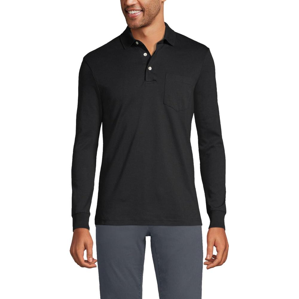 Lands’ End Men’s Long Sleeve American-Grown Supima Cotton Polo Shirt with Pocket(Black)