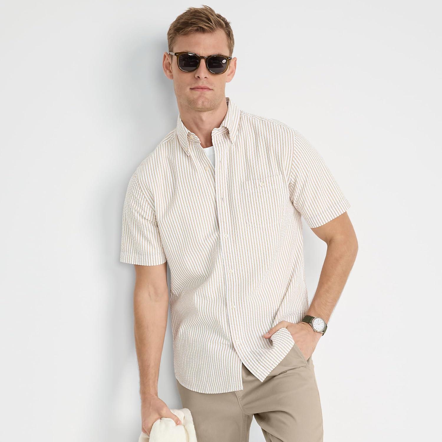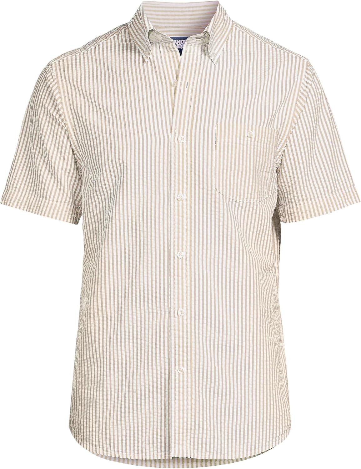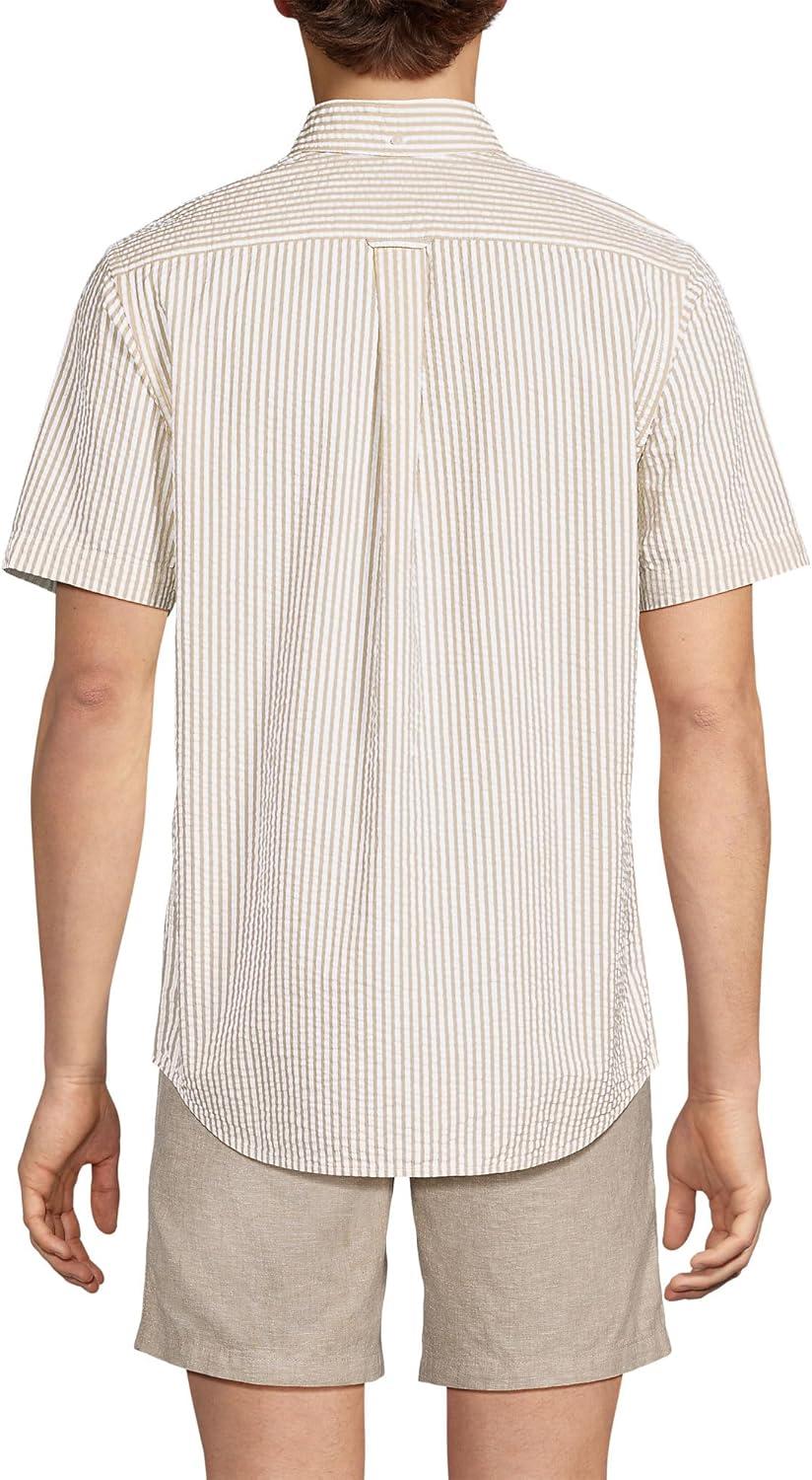 Lands’ End Men’s Short Sleeve Seersucker Shirt(Golden Sand Banker Stripe)