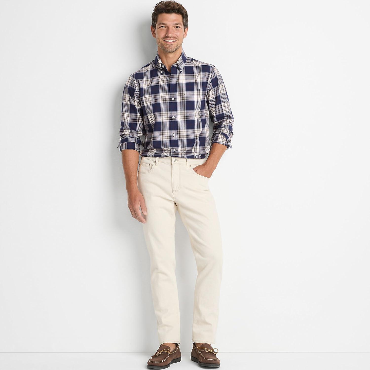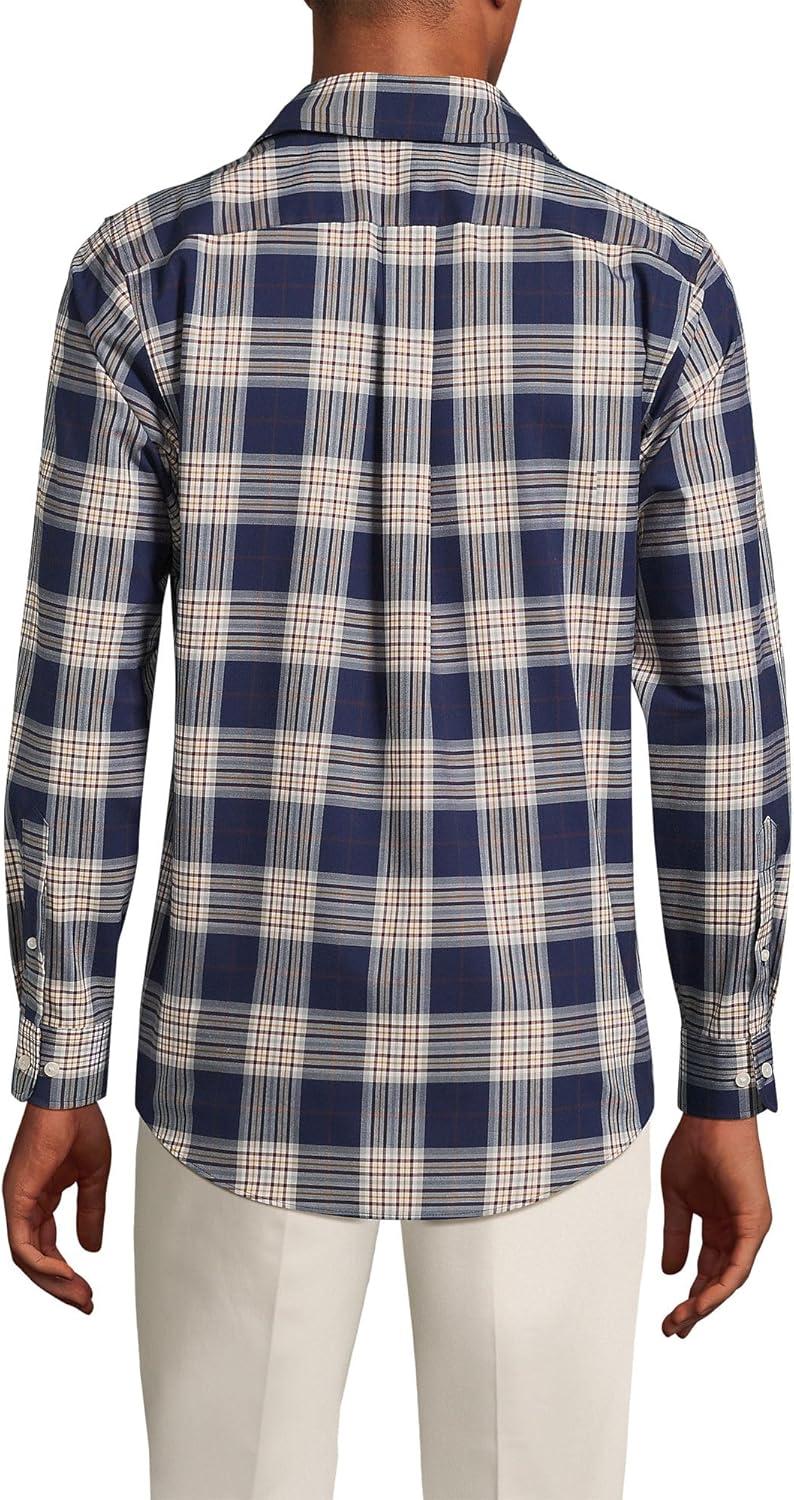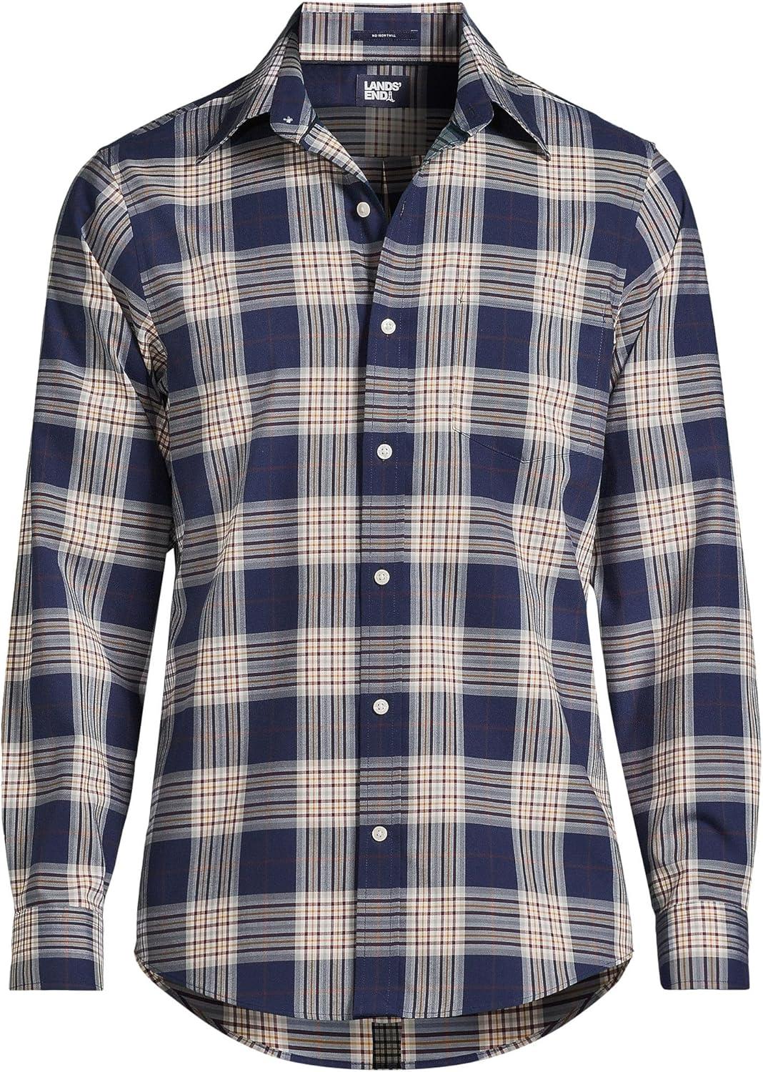 Lands’ End Men’s Tailored Fit No Iron Twill Long Sleeve Shirt(Deep Sea Navy/Burgundy Plaid)