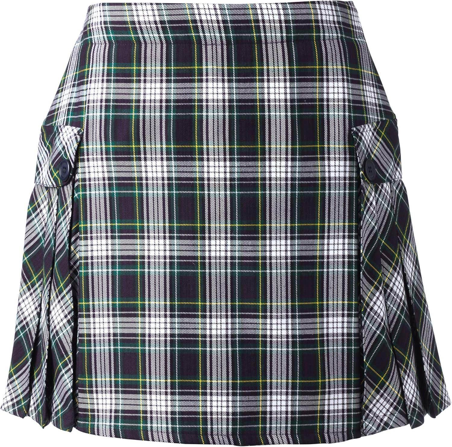 Lands’ End School Uniform Young Women’s Side Pleat Plaid Skort Above The Knee(White/Evergreen Plaid)