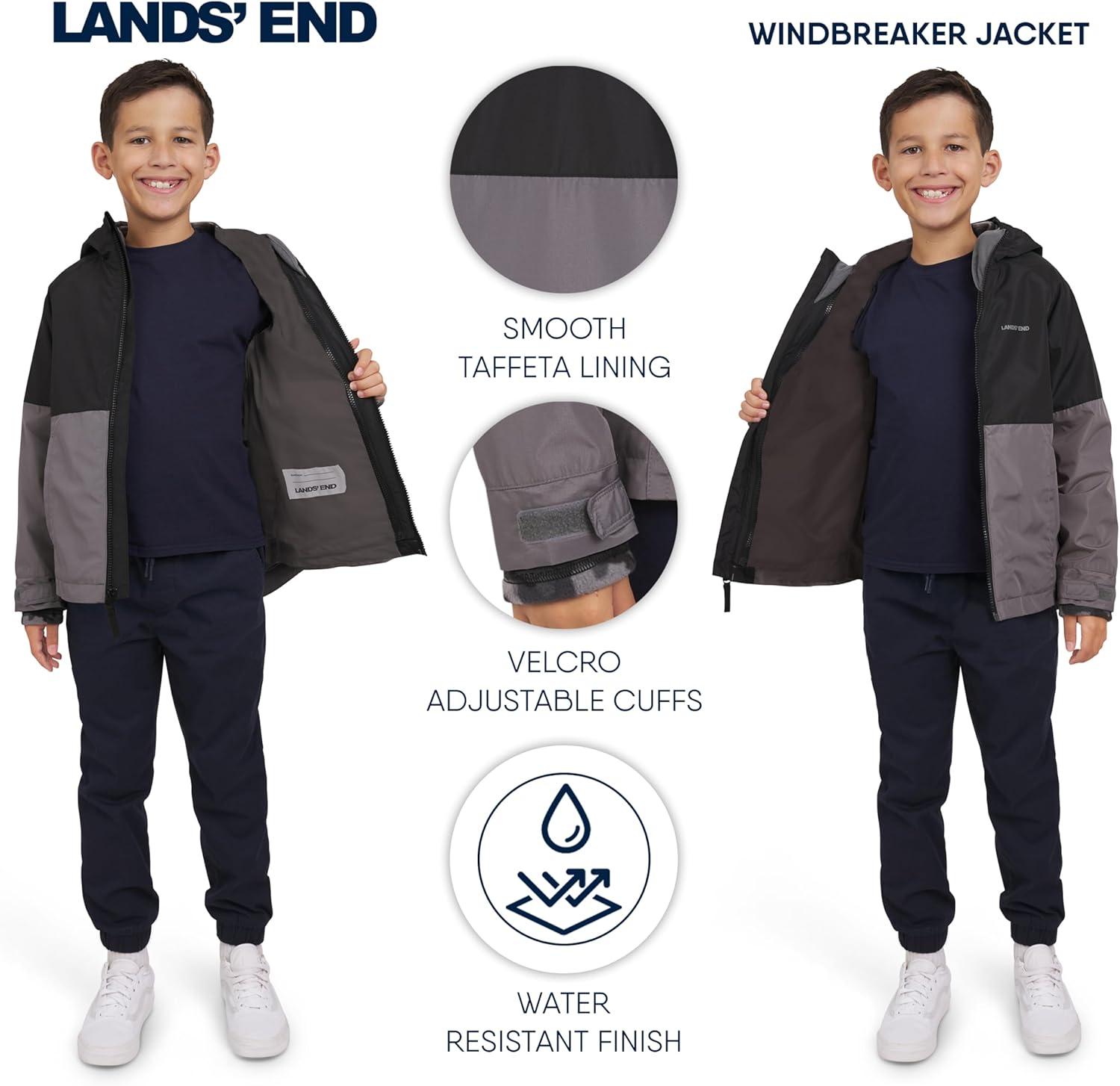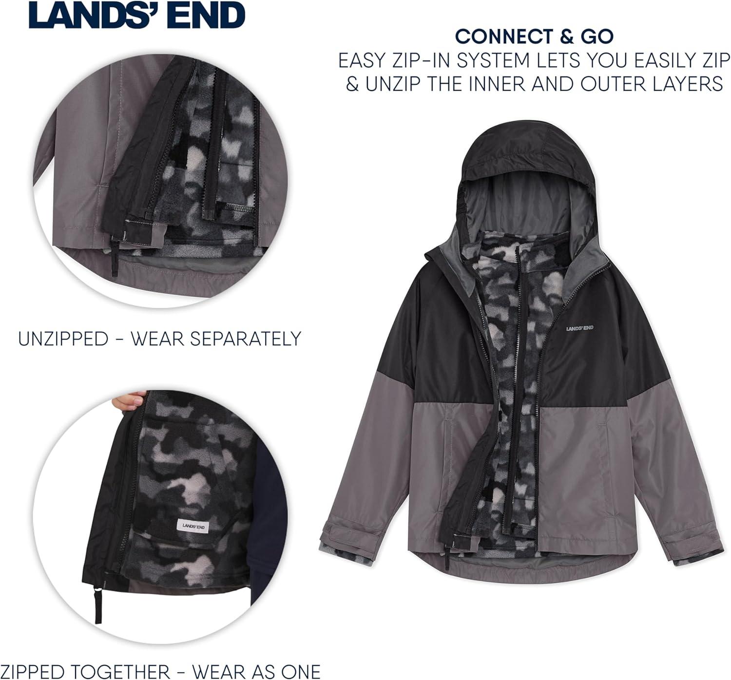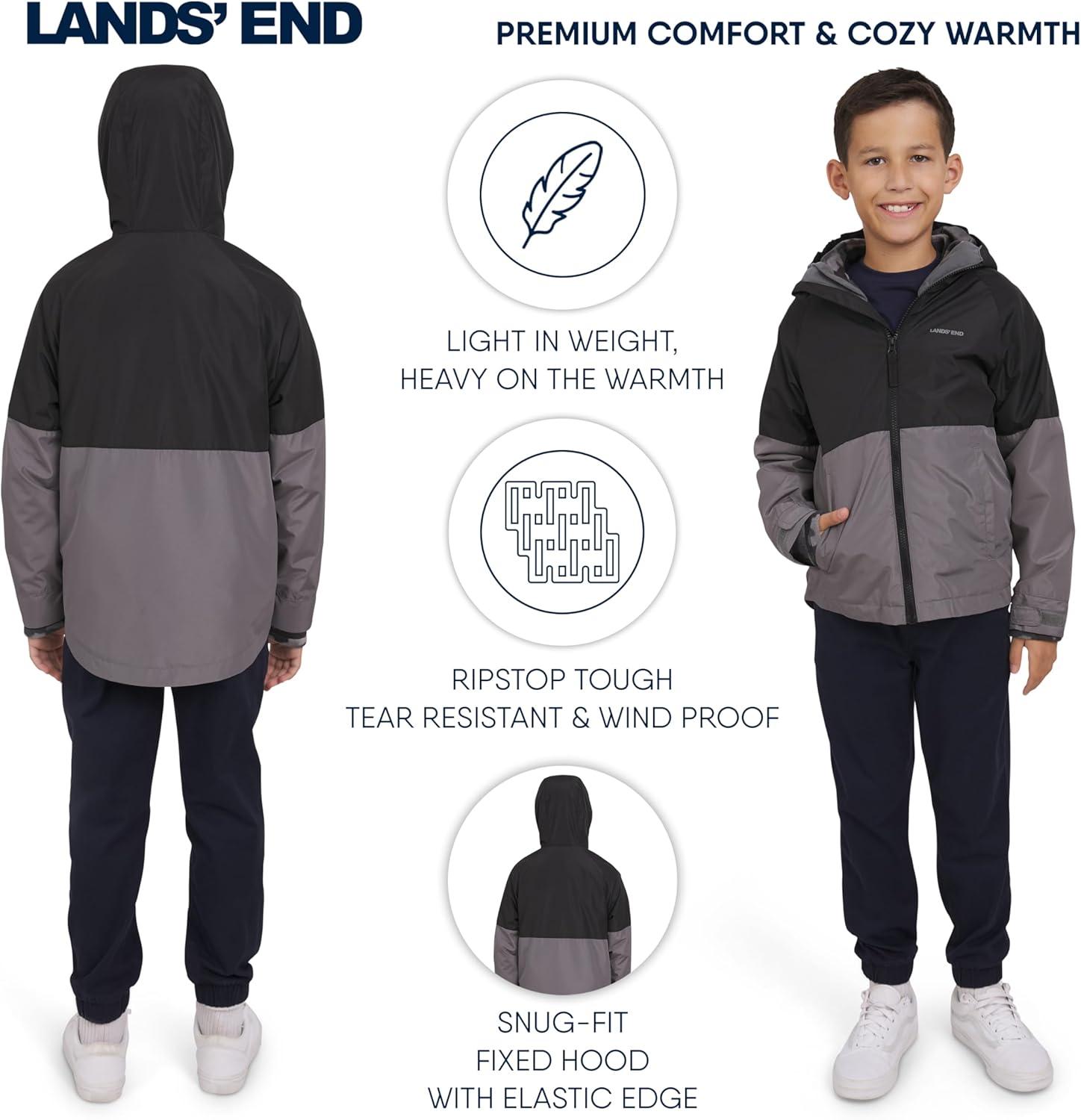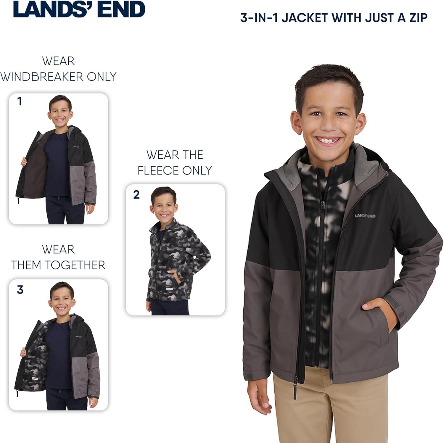 A legacy of timeless quality and dependable design, Lands' End is committed to crafting comfortable, durable clothing for everyday life. This jacket embodies that promise with its 3-in-1 versatility, giving them three jackets in one to handle any weather. A removable fleece liner zips quickly into a durable, water-resistant windbreaker. They can wear the windbreaker alone for active days, the fleece for a cozy look, or zip them together for a warmer jacket in cold weather. Experience the ultimate in softness and warmth with this versatile design. The plush polar fleece interior feels cozy against the skin, delivering a lightweight feel that's heavy on the warmth. At the same time, this windbreaker jacket provides a reliable defense against the elements. The durable ripstop fabric resists wind and tearing, while a snug-fit hood and Velcro-adjustable cuffs help to seal out cold drafts, ensuring they stay comfortable in any conditions. This jacket is built with smart design and quality construction from top to bottom. A clever zip-in system securely attaches the two pieces, while the jacket features a total of four side pockets—two on the windbreaker and two on the fleece—for secure storage. For easy care, it is machine washable, and the smooth taffeta lining ensures it's easy to slip on and off. With a locker loop for simple hanging and a reflective logo, this jacket is a dependable choice for all of their adventures.