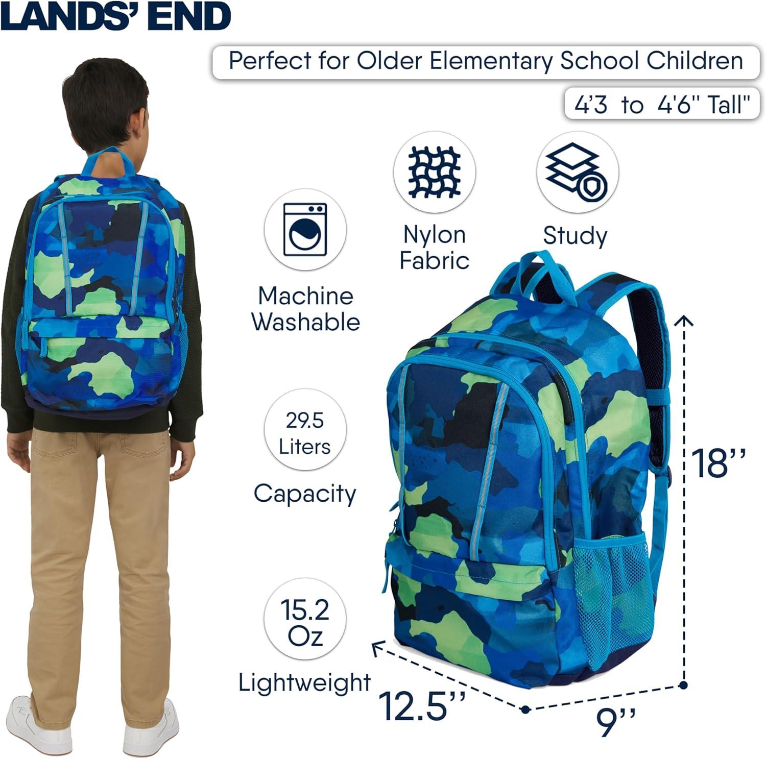 Since 1963, Lands' End has been a trusted name for classic American style, with a brand legacy built on quality and lasting durability. This backpack embodies that unwavering commitment by being the ultimate companion for your child's busy life. Perfectly sized for school, camping, travel, outings, playdates, and sleepovers, its spacious interior easily holds all the essentials. From school supplies and a lunch box to gym clothes, snacks, and toys, this backpack is ready for any adventure. This backpack is built for lasting performance, weighing just 15.2 ounces and made from a sturdy, high-quality reinforced nylon fabric. For a secure and comfortable fit, it features adjustable shoulder straps with PE foam padding and an adjustable chest strap with buckle closure. A reinforced top handle doubles as a convenient hand grip and wall hanger, while high-quality zippers provide easy access to the two-way zippered main compartment, a front pocket, and two mesh side pockets perfect for water bottles. The interior is designed to keep everything safe and organized. It includes a double padded laptop pocket measuring 12″ Wide x 13″ Deep for securely storing a small laptop or tablet, and two utility pockets perfect for holding pens, a small notebook, or a wallet. An interior name tag label is also featured for easy identification. With a generous 29.5 liter capacity (18″ x 12.5″ x 9″), this large backpack is perfectly proportioned for older elementary school children between 4.3' and 4'6″ tall.